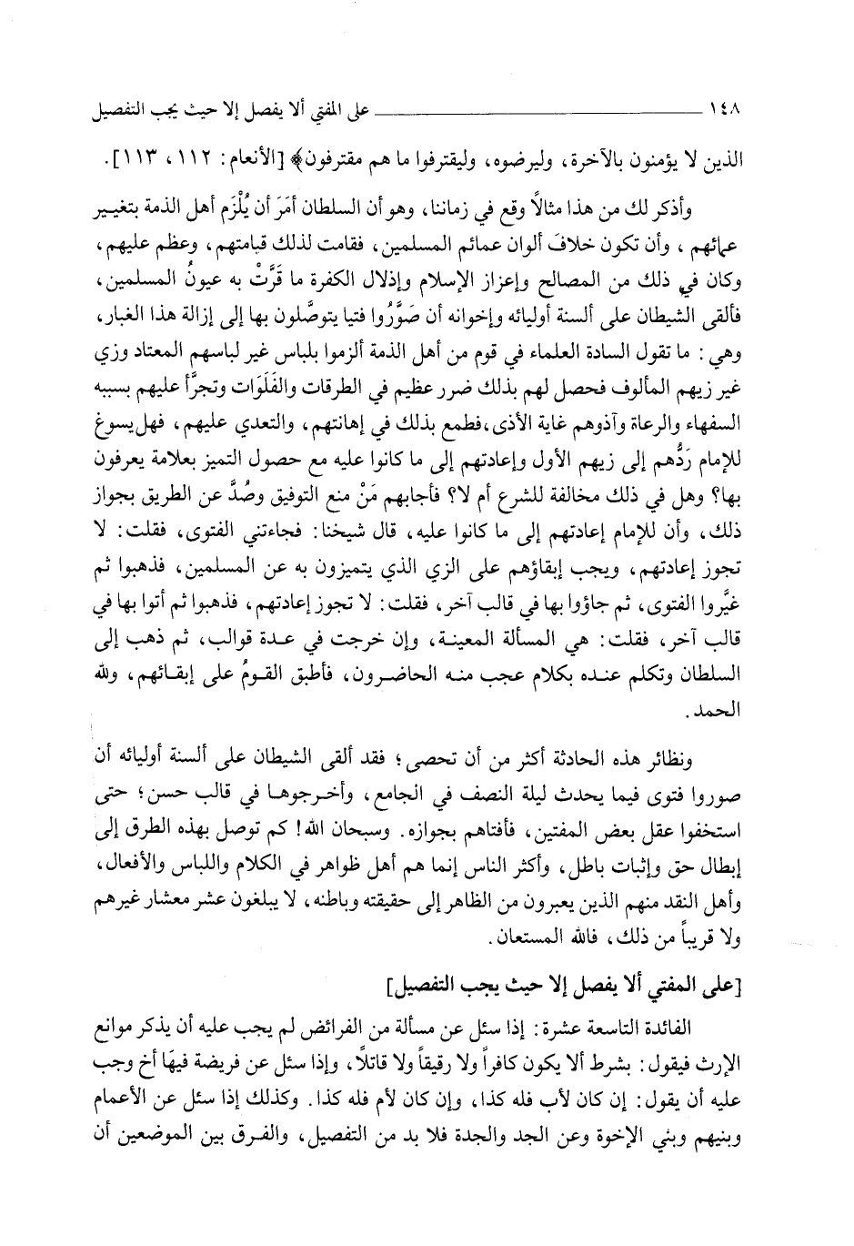 [عَلَى الْمُفْتِي أَلَّا يُفَصِّلَ إلَّا حَيْثُ يَجِبُ التَّفْصِيلُ] الْفَائِدَةُ التَّاسِعَةَ عَشْرَةَ: