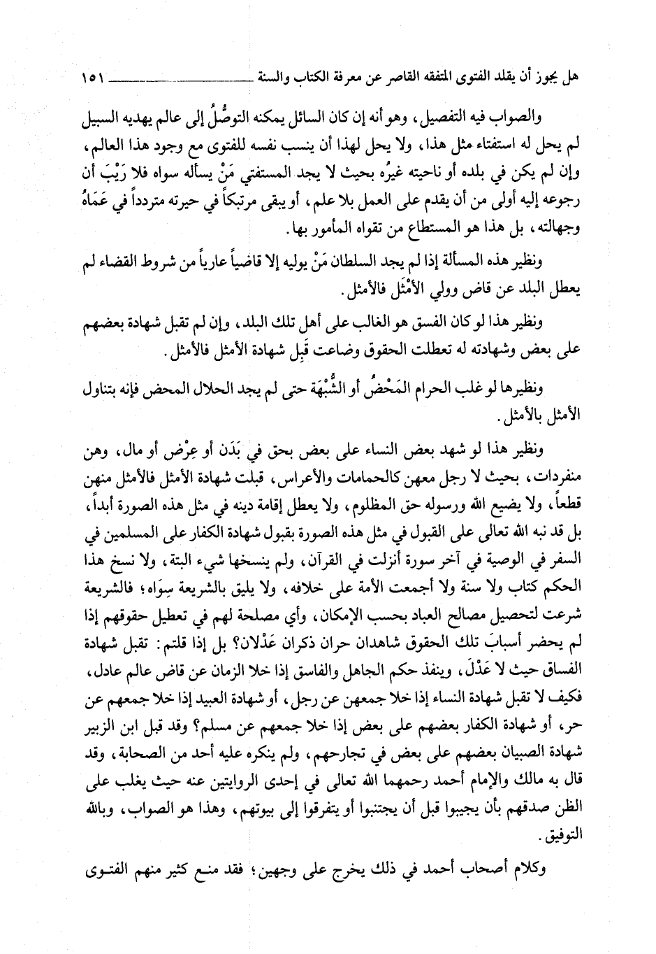 وَالصَّوَابُ فِيهِ التَّفْصِيلُ، وَهُوَ أَنَّهُ إنْ كَانَ السَّائِلُ يُمْكِنُهُ التَّوَصُّلُ إلَى عَالِمٍ يَهْدِيهِ السَّبِيلَ لَمْ يَحِلَّ لَهُ اسْتِفْتَاءُ مِثْلِ هَذَا، وَلَا يَحِلُّ لِهَذَا أَنْ يَنْسُبَ نَفْسَهُ لِلْفَتْوَى مَعَ وُجُودِ هَذَا الْعَالِمِ، وَإِنْ لَمْ يَكُنْ فِي بَلَدِهِ أَوْ نَاحِيَتِهِ غَيْرُهُ بِحَيْثُ لَا يَجِدُ الْمُسْتَفْتِي مَنْ يَسْأَلُهُ سِوَاهُ فَلَا رَيْبَ أَنَّ رُجُوعَهُ إلَيْهِ أَوْلَى مِنْ أَنْ يُقْدِمَ عَلَى الْعَمَلِ بِلَا عِلْمٍ، أَوْ يَبْقَى مُرْتَبِكًا فِي حَيْرَتِهِ مُتَرَدِّدًا فِي عَمَاهُ وَجَهَالَتِهِ، بَلْ هَذَا هُوَ الْمُسْتَطَاعُ مِنْ تَقْوَاهُ الْمَأْمُورِ بِهَا.