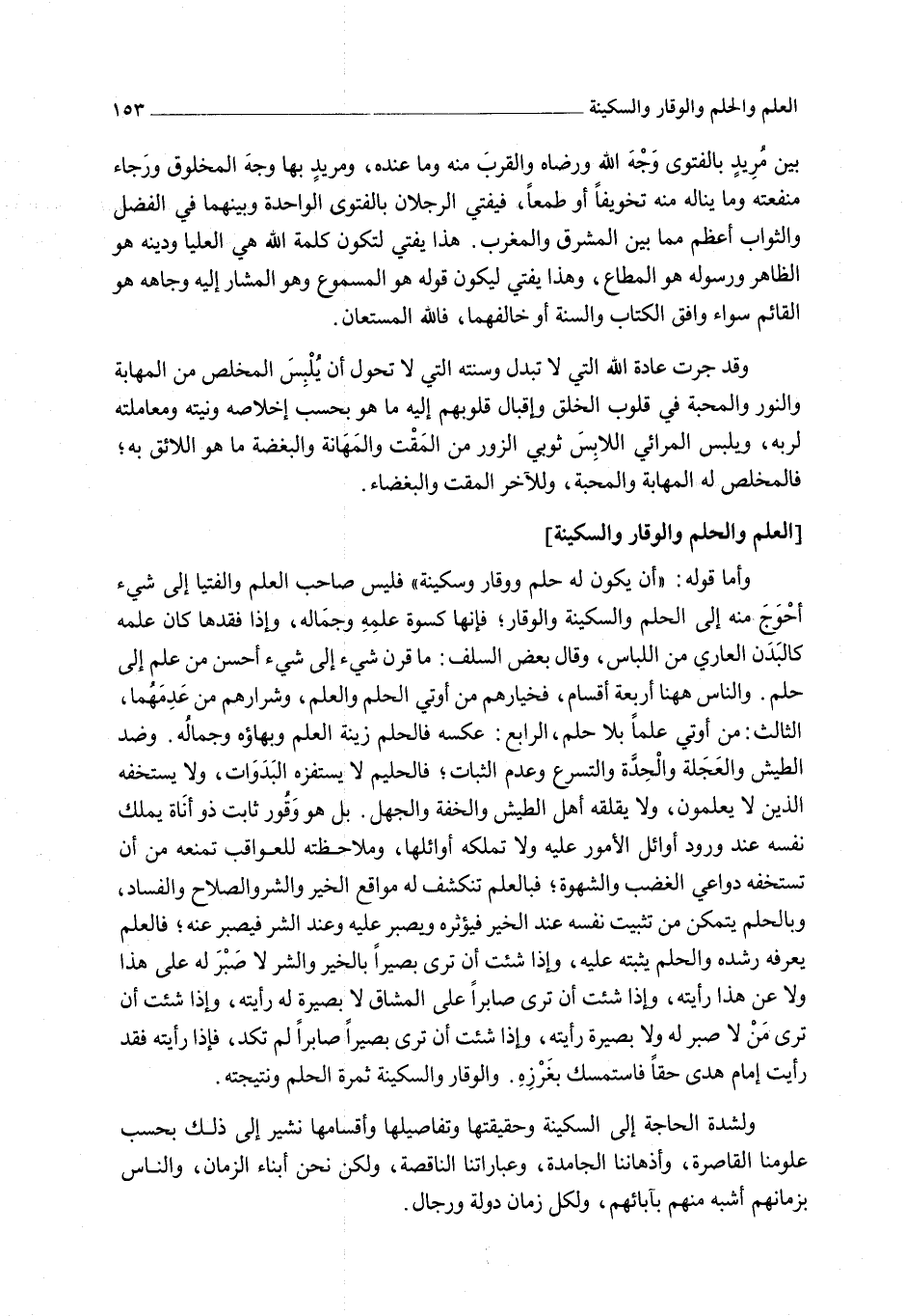 بَلْ هُوَ وَقُورٌ ثَابِتٌ ذُو أَنَاةٍ يَمْلِكُ نَفْسَهُ عِنْدَ وُرُودِ أَوَائِلِ الْأُمُورِ عَلَيْهِ وَلَا تَمْلِكُهُ أَوَائِلُهَا، وَمُلَاحَظَتُهُ لِلْعَوَاقِبِ تَمْنَعُهُ مِنْ أَنْ تَسْتَخِفَّهُ دَوَاعِي الْغَضَبِ وَالشَّهْوَةِ؛ فَبِالْعِلْمِ تَنْكَشِفُ لَهُ مَوَاقِعُ الْخَيْرِ وَالشَّرِّ وَالصَّلَاحِ وَالْفَسَادِ، وَبِالْحِلْمِ يَتَمَكَّنُ مِنْ تَثْبِيتِ نَفْسِهِ عِنْدَ الْخَيْرِ فَيُؤْثِرُهُ وَيَصِيرُ عَلَيْهِ وَعِنْدَ الشَّرِّ فَيَصْبِرُ عَنْهُ؛ فَالْعِلْمُ يُعَرِّفُهُ رُشْدَهُ وَالْحِلْمُ يُثَبِّتُهُ عَلَيْهِ، وَإِذَا شِئْتَ أَنْ تَرَى بَصِيرًا بِالْخَيْرِ وَالشَّرِّ لَا صَبْرَ لَهُ عَلَى هَذَا وَلَا عَنْ هَذَا رَأَيْته، وَإِذَا شِئْتَ أَنْ تَرَى صَابِرًا عَلَى الْمَشَاقِّ لَا بَصِيرَةَ لَهُ رَأَيْتَهُ، وَإِذَا شِئْتَ أَنْ تَرَى مِنْ لَا صَبْرَ لَهُ وَلَا بَصِيرَةَ رَأَيْتَهُ، وَإِذَا شِئْتَ أَنْ تَرَى بَصِيرًا صَابِرًا لَمْ تَكَدْ، فَإِذَا رَأَيْتَهُ فَقَدْ رَأَيْتَ إمَامَ هُدًى حَقًّا فَاسْتَمْسِكْ بِغَرْزِهِ.