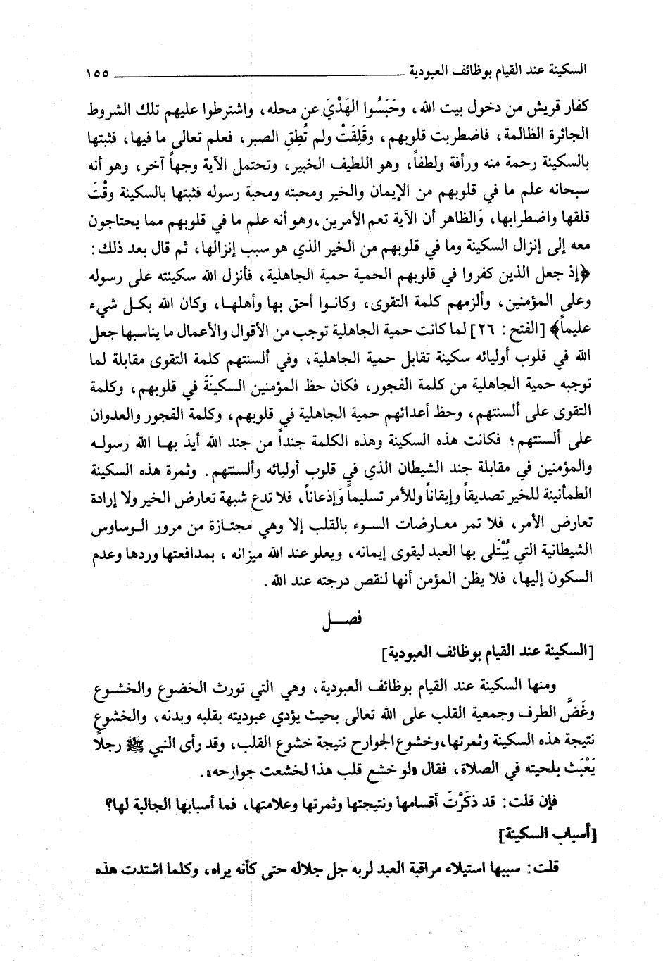 [السَّكِينَةُ عِنْدَ الْقِيَامِ بِوَظَائِفِ الْعُبُودِيَّةِ] وَمِنْهَا السَّكِينَةُ عِنْدَ الْقِيَامِ بِوَظَائِف الْعُبُودِيَّةِ، وَهِيَ الَّتِي تُوَرِّثُ الْخُضُوعَ وَالْخُشُوعَ وَغَضَّ الطَّرَفِ وَجَمْعِيَّةَ الْقَلْبِ عَلَى اللَّهِ - تَعَالَى - بِحَيْثُ يُؤَدِّي عُبُودِيَّتَهُ بِقَلْبِهِ وَبَدَنِهِ، وَالْخُشُوعُ نَتِيجَةُ هَذِهِ السَّكِينَةِ وَثَمَرَتُهَا، وَخُشُوعُ الْجَوَارِحِ نَتِيجَةُ خُشُوعِ الْقَلْبِ، وَقَدْ رَأَى النَّبِيُّ - صَلَّى اللَّهُ عَلَيْهِ وَسَلَّمَ - رَجُلًا يَعْبَثُ بِلِحْيَتِهِ فِي الصَّلَاةِ، فَقَالَ «لَوْ خَشَعَ قَلْبُ هَذَا لَخَشَعَتْ جَوَارِحُهُ» .
