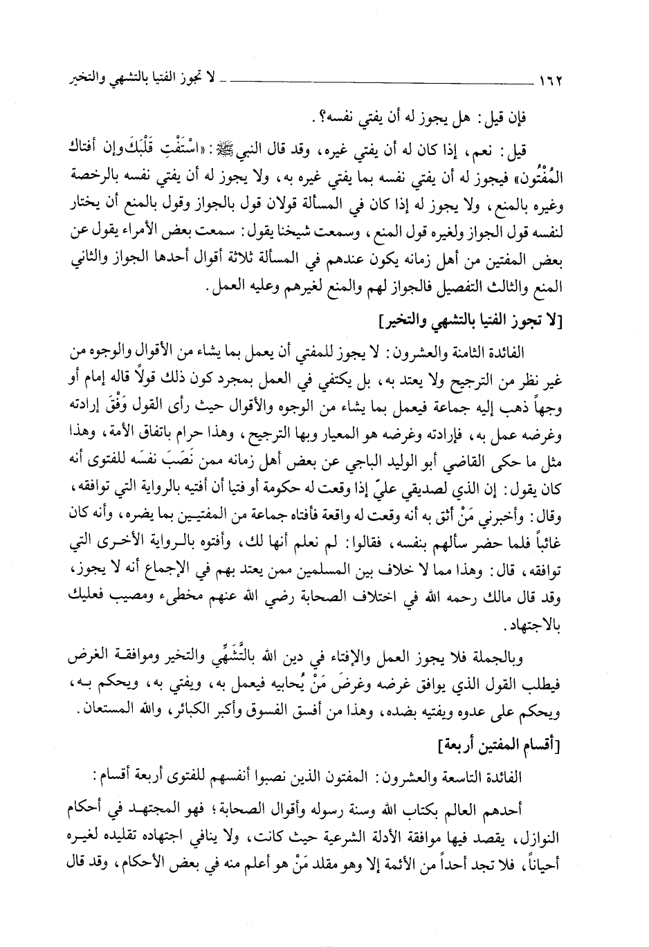 [لَا تَجُوزُ الْفُتْيَا بِالتَّشَهِّي وَالتَّخَيُّرِ] الْفَائِدَةُ الثَّامِنَةُ وَالْعِشْرُونَ: لَا يَجُوزُ لِلْمُفْتِي أَنْ يَعْمَلَ بِمَا يَشَاءُ مِنْ الْأَقْوَالِ وَالْوُجُوهِ مِنْ غَيْرِ نَظَرٍ مِنْ التَّرْجِيحِ وَلَا يَعْتَدُّ بِهِ، بَلْ يَكْتَفِي فِي الْعَمَلِ بِمُجَرَّدِ كَوْنِ ذَلِكَ قَوْلًا قَالَهُ إمَامٌ أَوْ وَجْهًا ذَهَبَ إلَيْهِ جَمَاعَةٌ فَيَعْمَلُ بِمَا يَشَاءُ مِنْ الْوُجُوهِ وَالْأَقْوَالِ حَيْثُ رَأَى الْقَوْلَ وَفْقَ إرَادَتِهِ وَغَرَضِهِ عَمِلَ بِهِ، فَإِرَادَتُهُ وَغَرَضُهُ هُوَ الْمِعْيَارُ وَبِهَا التَّرْجِيحُ، وَهَذَا حَرَامٌ بِاتِّفَاقِ الْأُمَّةِ، وَهَذَا مِثْلُ مَا حَكَى الْقَاضِي أَبُو الْوَلِيدِ الْبَاجِيَّ عَنْ بَعْضِ أَهْلِ زَمَانِهِ مِمَّنْ نَصَّبَ نَفْسَهُ لِلْفَتْوَى أَنَّهُ كَانَ يَقُولُ: إنَّ الَّذِي لِصَدِيقِي عَلَيَّ إذَا وَقَعَتْ لَهُ حُكُومَةٌ أَوْ فُتْيَا أَنْ أُفْتِيَهُ بِالرِّوَايَةِ الَّتِي تُوَافِقُهُ، وَقَالَ: وَأَخْبَرَنِي مَنْ أَثِقُ بِهِ أَنَّهُ وَقَعَتْ لَهُ وَاقِعَةٌ فَأَفْتَاهُ جَمَاعَةٌ مِنْ الْمُفْتِيَيْنِ بِمَا يَضُرُّهُ، وَأَنَّهُ كَانَ غَائِبًا فَلَمَّا حَضَرَ سَأَلَهُمْ بِنَفْسِهِ، فَقَالُوا: لَمْ نَعْلَمْ أَنَّهَا لَكَ، وَأَفْتَوْهُ بِالرِّوَايَةِ الْأُخْرَى الَّتِي تُوَافِقُهُ، قَالَ: وَهَذَا مِمَّا لَا خِلَافَ بَيْنَ الْمُسْلِمِينَ مِمَّنْ يُعْتَدُّ بِهِمْ فِي الْإِجْمَاعِ أَنَّهُ لَا يَجُوزُ، وَقَدْ قَالَ مَالِكٌ - رَحِمَهُ اللَّهُ - فِي اخْتِلَافِ الصَّحَابَةِ - رَضِيَ اللَّهُ عَنْهُمْ - مُخْطِئٌ وَمُصِيبٌ فَعَلَيْكَ بِالِاجْتِهَادِ.