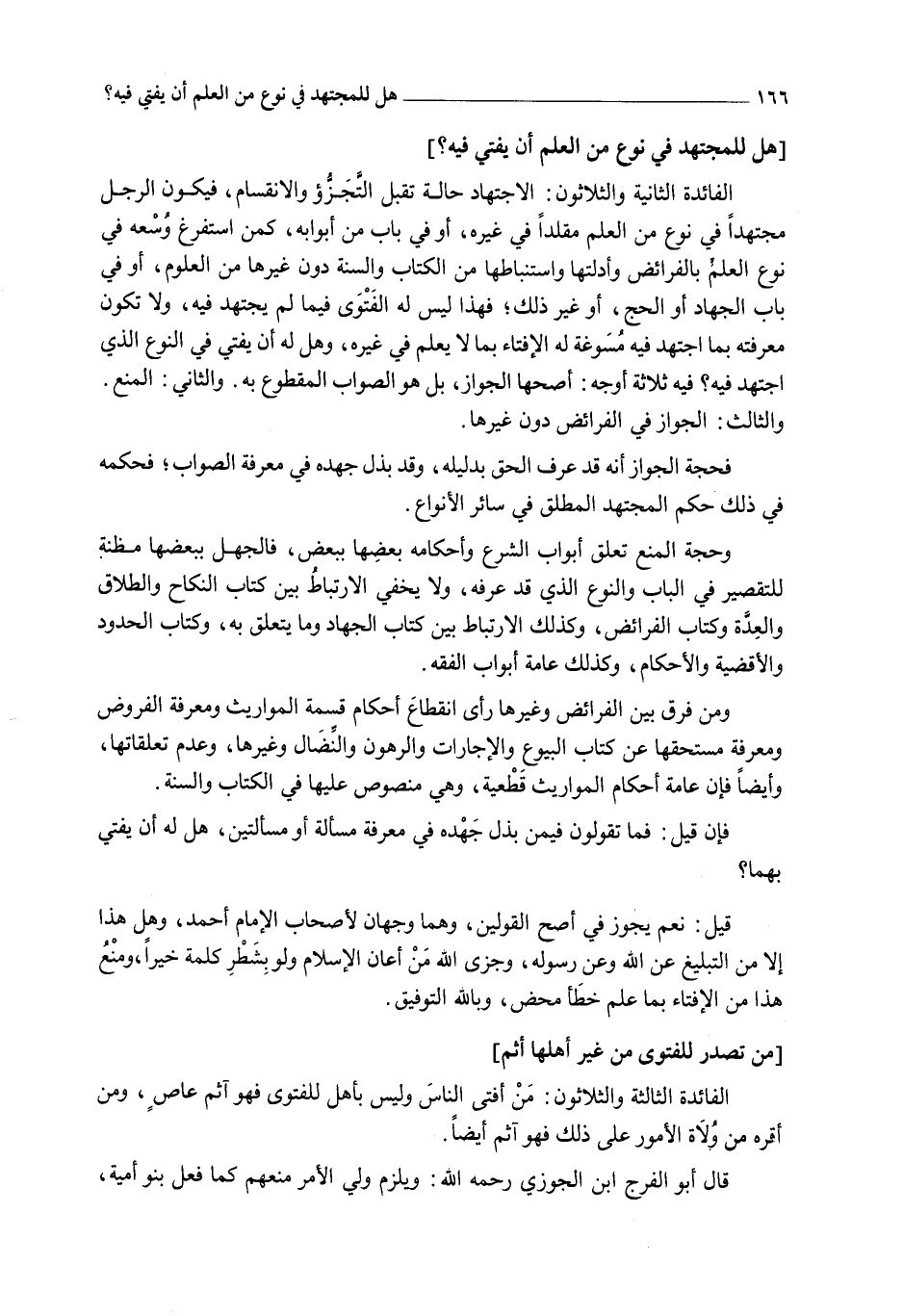ِ؟] الْفَائِدَةُ الثَّانِيَةُ وَالثَّلَاثُونَ: الِاجْتِهَادُ حَالَةٌ تَقْبَلُ التَّجَزُّؤَ وَالِانْقِسَامَ، فَيَكُونُ الرَّجُلُ مُجْتَهِدًا فِي نَوْعٍ مِنْ الْعِلْمِ مُقَلِّدًا فِي غَيْرِهِ، أَوْ فِي بَابٍ مِنْ أَبْوَابِهِ، كَمَنْ اسْتَفْرَغَ وُسْعَهُ فِي نَوْعِ الْعِلْمِ بِالْفَرَائِضِ وَأَدِلَّتِهَا وَاسْتِنْبَاطِهَا مِنْ الْكِتَابِ وَالسُّنَّةِ دُونَ غَيْرِهَا مِنْ الْعُلُومِ، أَوْ فِي بَابِ الْجِهَادِ أَوْ الْحَجِّ، أَوْ غَيْرِ ذَلِكَ؛ فَهَذَا لَيْسَ لَهُ الْفَتْوَى فِيمَا لَمْ يَجْتَهِدْ فِيهِ، وَلَا تَكُونُ مَعْرِفَتُهُ بِمَا اجْتَهَدَ فِيهِ مُسَوِّغَةً لَهُ الْإِفْتَاءَ بِمَا لَا يَعْلَمُ فِي غَيْرِهِ، وَهَلْ لَهُ أَنْ يُفْتِيَ فِي النَّوْعِ الَّذِي اجْتَهَدَ فِيهِ؟ فِيهِ ثَلَاثَةُ أَوْجُهٍ: أَصَحُّهَا الْجَوَازُ، بَلْ هُوَ الصَّوَابُ الْمَقْطُوعُ بِهِ.
