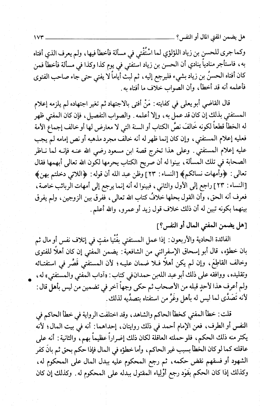 وَكَمَا جَرَى لِلْحَسَنِ بْنِ زِيَادٍ اللُّؤْلُؤِيِّ لَمَّا اُسْتُفْتِيَ فِي مَسْأَلَةٍ فَأَخْطَأَ فِيهَا، وَلَمْ يَعْرِفْ الَّذِي أَفْتَاهُ بِهِ، فَاسْتَأْجَرَ مُنَادِيًا يُنَادِي أَنَّ الْحَسَنَ بْنَ زِيَادٍ اُسْتُفْتِيَ فِي يَوْمِ كَذَا وَكَذَا فِي مَسْأَلَةٍ فَأَخْطَأَ فَمَنْ كَانَ أَفْتَاهُ الْحَسَنُ بْنُ زِيَادٍ بِشَيْءٍ فَلْيَرْجِعْ إلَيْهِ، ثُمَّ لَبِثَ أَيَّامًا لَا يُفْتِي حَتَّى جَاءَ صَاحِبُ الْفَتْوَى فَأَعْلَمَهُ أَنَّهُ قَدْ أَخْطَأَ، وَأَنَّ الصَّوَابَ خِلَافُ مَا أَفْتَاهُ بِهِ.