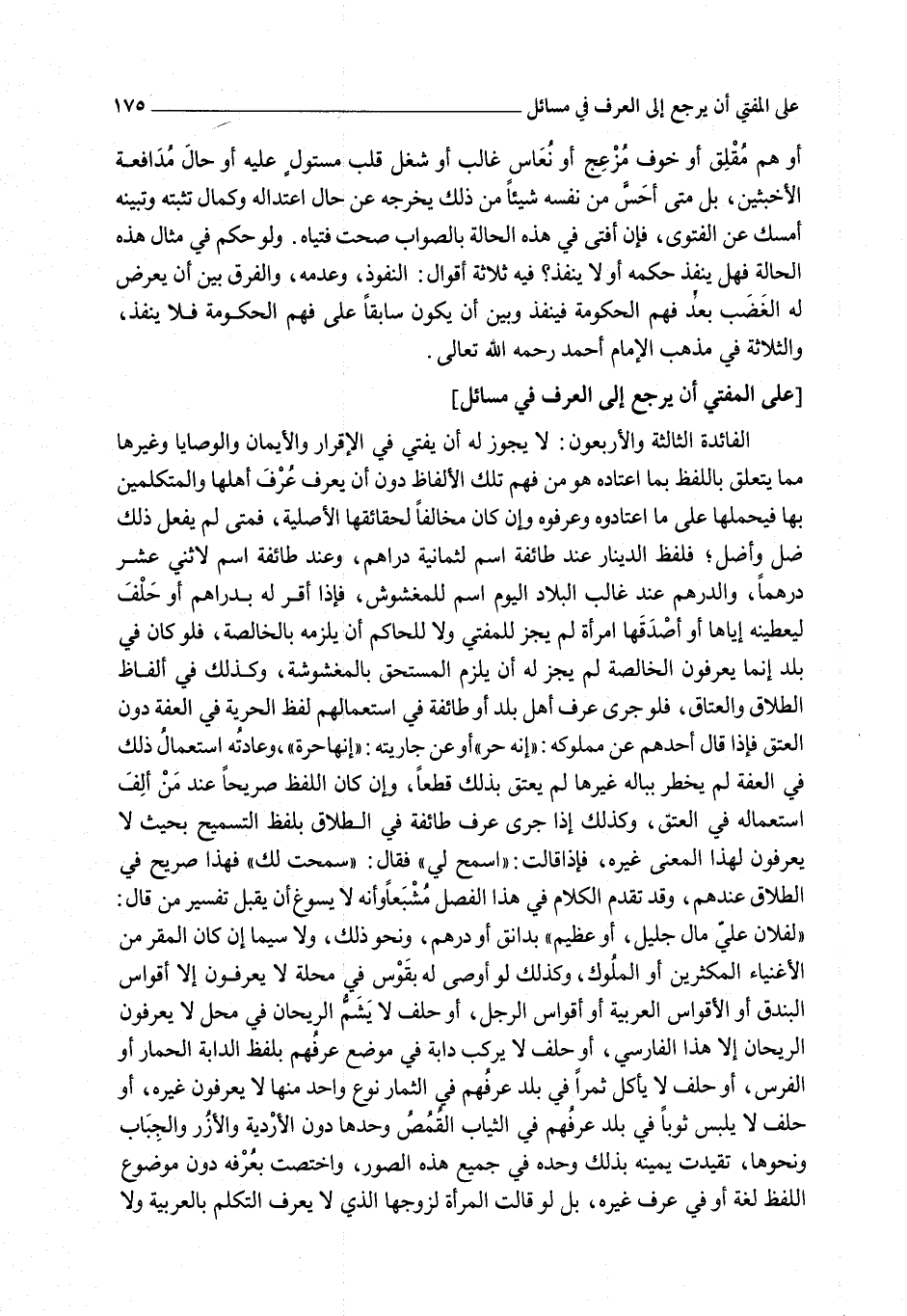[عَلَى الْمُفْتِي أَنْ يَرْجِعَ إلَى الْعُرْفِ فِي مَسَائِلَ] الْفَائِدَةُ الثَّالِثَةُ وَالْأَرْبَعُونَ: لَا يَجُوزُ لَهُ أَنْ يُفْتِيَ فِي الْإِقْرَارِ وَالْأَيْمَانِ وَالْوَصَايَا وَغَيْرِهَا مِمَّا يَتَعَلَّقُ بِاللَّفْظِ بِمَا اعْتَادَهُ هُوَ مِنْ فَهْمِ تِلْكَ الْأَلْفَاظِ دُونَ أَنْ يَعْرِفَ عُرْفَ أَهْلِهَا وَالْمُتَكَلِّمِينَ بِهَا فَيَحْمِلَهَا عَلَى مَا اعْتَادُوهُ وَعَرَفُوهُ، وَإِنْ كَانَ مُخَالِفًا لِحَقَائِقِهَا الْأَصْلِيَّةِ، فَمَتَى لَمْ يَفْعَلْ ذَلِكَ ضَلَّ وَأَضَلَّ؛ فَلَفْظُ الدِّينَارِ عِنْدَ طَائِفَةٍ اسْمٌ لِثَمَانِيَةِ دَرَاهِمَ، وَعِنْدَ طَائِفَةٍ اسْمٌ لِاثْنَيْ عَشْرَ دِرْهَمًا، وَالدِّرْهَمُ عِنْدَ غَالِبِ الْبِلَادِ الْيَوْمَ اسْمٌ لِلْمَغْشُوشِ، فَإِذَا أَقَرَّ لَهُ بِدَرَاهِمَ أَوْ حَلَفَ لَيُعْطِيَنَّهُ إيَّاهَا أَوْ أَصْدَقَهَا امْرَأَةً لَمْ يَجُزْ لِلْمُفْتِي وَلَا لِلْحَاكِمِ أَنْ يُلْزِمَهُ بِالْخَالِصَةِ، فَلَوْ كَانَ فِي بَلَدٍ إنَّمَا يَعْرِفُونَ الْخَالِصَةَ لَمْ يَجُزْ لَهُ أَنْ يُلْزِمَ الْمُسْتَحِقَّ بِالْمَغْشُوشَةِ، وَكَذَلِكَ فِي أَلْفَاظِ الطَّلَاقِ وَالْعَتَاقِ، فَلَوْ جَرَى عُرْفُ أَهْلِ بَلَدٍ أَوْ طَائِفَةٍ فِي اسْتِعْمَالِهِمْ لَفْظَ الْحُرِّيَّةِ فِي الْعِفَّةِ دُونَ الْعِتْقِ، فَإِذَا قَالَ أَحَدُهُمْ عَنْ مَمْلُوكِهِ: " إنَّهُ حُرٌّ " أَوْ عَنْ جَارِيَتِهِ: " إنَّهَا حُرَّةٌ "، وَعَادَتُهُ اسْتِعْمَالُ ذَلِكَ فِي الْعِفَّةِ لَمْ يَخْطُرْ بِبَالِهِ غَيْرُهَا لَمْ يُعْتَقْ بِذَلِكَ قَطْعًا، وَإِنْ كَانَ اللَّفْظُ صَرِيحًا عِنْدَ مَنْ أَلِفَ اسْتِعْمَالَهُ فِي الْعِتْقِ، وَكَذَلِكَ إذَا جَرَى عُرْفُ طَائِفَةٍ فِي الطَّلَاقِ بِلَفْظِ التَّسْمِيحِ بِحَيْثُ لَا يَعْرِفُونَ لِهَذَا الْمَعْنَى غَيْرَهُ، فَإِذَا قَالَتْ: " اسْمَحْ لِي " فَقَالَ: " سَمَحْتُ لَكَ " فَهَذَا صَرِيحٌ فِي الطَّلَاقِ عِنْدَهُمْ، وَقَدْ تَقَدَّمَ الْكَلَامُ فِي هَذَا الْفَصْلِ مُشَبَّعًا وَأَنَّهُ لَا يَسُوغُ أَنْ يُقْبَلَ تَفْسِيرُ مَنْ قَالَ: " لِفُلَانٍ عَلَيَّ مَالٌ جَلِيلٌ، أَوْ عَظِيمٌ " بِدَانَقٍ أَوْ دِرْهَمٍ، وَنَحْوِ ذَلِكَ، وَلَا سِيَّمَا إنْ كَانَ الْمُقِرُّ مِنْ الْأَغْنِيَاءِ الْمُكْثِرِينَ أَوْ الْمُلُوكِ، وَكَذَلِكَ لَوْ أَوْصَى لَهُ بِقَوْسٍ فِي مَحَلَّةٍ لَا يَعْرِفُونَ إلَّا أَقْوَاسَ الْبُنْدُقِ أَوْ الْأَقْوَاسَ الْعَرَبِيَّةَ أَوْ أَقْوَاسَ الرَّجُلِ، أَوْ حَلَفَ لَا يَشُمُّ الرَّيْحَانَ فِي مَحَلٍّ لَا يَعْرِفُونَ الرَّيْحَانَ إلَّا هَذَا الْفَارِسِيَّ، أَوْ حَلَفَ لَا يَرْكَبُ دَابَّةً فِي مَوْضِعِ عُرْفِهِمْ بِلَفْظِ الدَّابَّةِ الْحِمَارِ أَوْ الْفَرَسِ، أَوْ حَلَفَ لَا يَأْكُلُ ثَمَرًا فِي بَلَدٍ عُرْفُهُمْ فِي الثِّمَارِ نَوْعٌ وَاحِدٌ مِنْهَا لَا يَعْرِفُونَ غَيْرَهُ، أَوْ حَلَفَ لَا يَلْبَسُ ثَوْبًا فِي بَلَدٍ عُرْفُهُمْ فِي الثِّيَابِ الْقُمُصُ وَحْدَهَا دُونَ الْأَرْدِيَةِ وَالْأُزُرِ وَالْجِبَابِ وَنَحْوِهَا، تَقَيَّدَتْ يَمِينُهُ بِذَلِكَ وَحْدَهُ فِي جَمِيعِ هَذِهِ الصُّوَرِ، وَاخْتَصَّتْ بِعُرْفِهِ دُونَ مَوْضُوعِ اللَّفْظِ لُغَةً أَوْ فِي عُرْفِ غَيْرِهِ، بَلْ لَوْ قَالَتْ الْمَرْأَةُ لِزَوْجِهَا الَّذِي لَا يَعْرِفُ التَّكَلُّمَ بِالْعَرَبِيَّةِ وَلَا