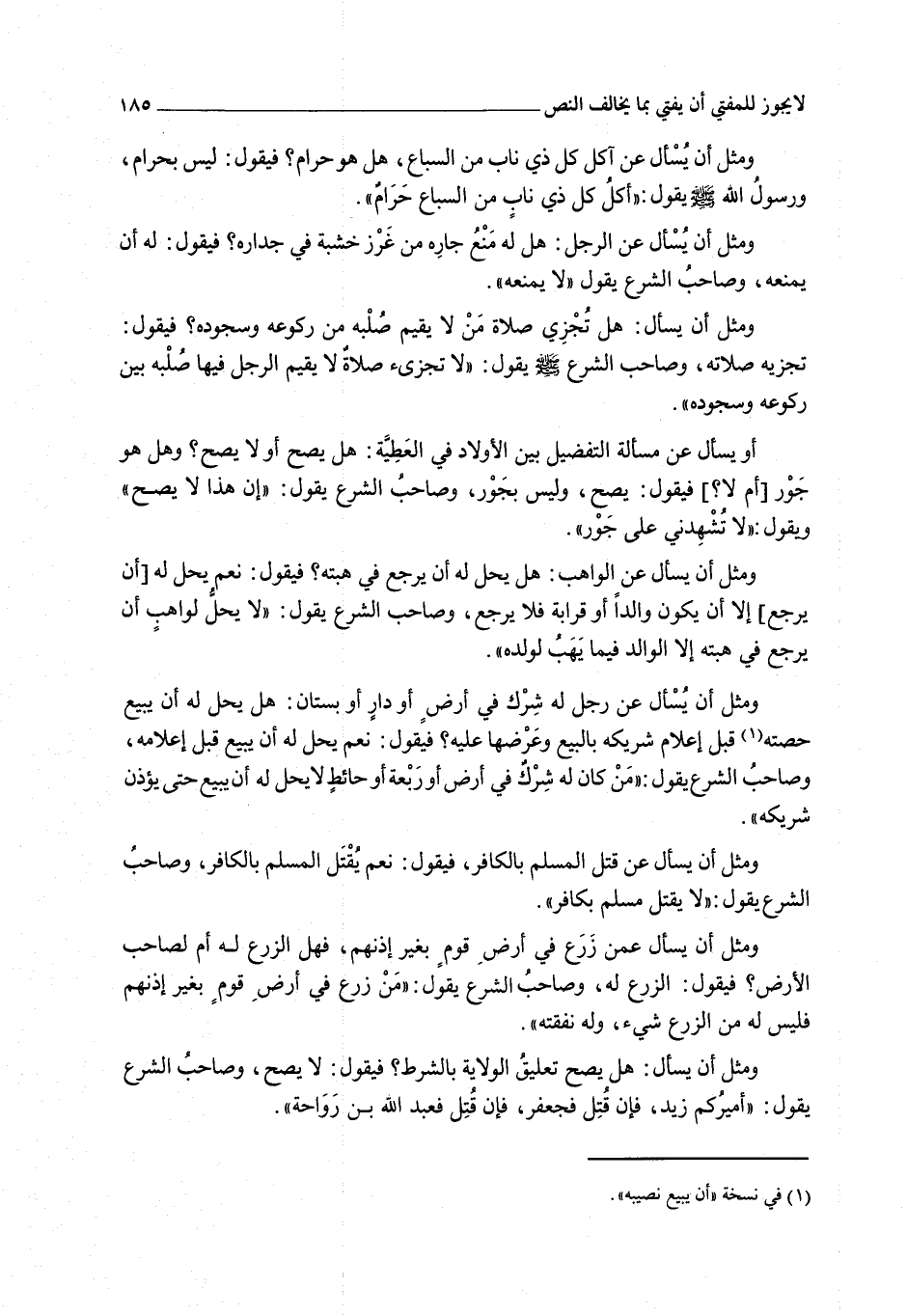 أَوْ يُسْأَلُ عَنْ مَسْأَلَةِ التَّفْضِيلِ بَيْنَ الْأَوْلَادِ فِي الْعَطِيَّةِ: هَلْ يَصِحُّ أَوْ لَا يَصِحُّ؟ وَهَلْ هُوَ جَوْرٌ [أَمْ لَا؟] فَيَقُولَ: يَصِحُّ، وَلَيْسَ بِجَوْرٍ، وَصَاحِبُ الشَّرْعِ يَقُولُ: " إنَّ هَذَا لَا يَصِحُّ " وَيَقُولُ: «لَا تُشْهِدْنِي عَلَى جَوْرٍ» .