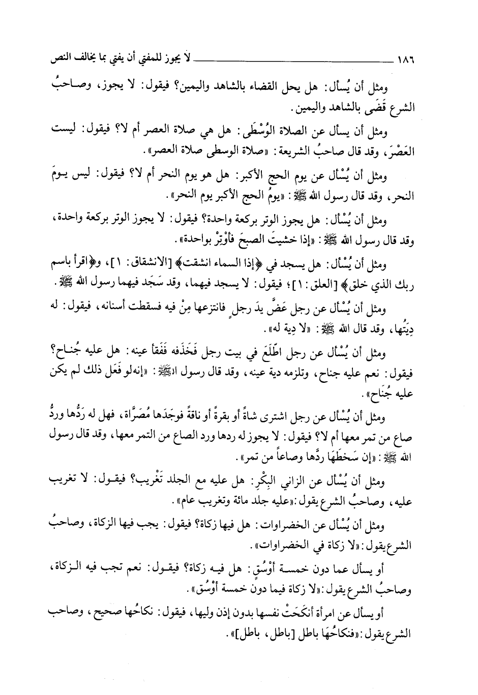 وَمِثْلُ أَنْ يُسْأَلَ: هَلْ يُسْجَدُ فِي {إِذَا السَّمَاءُ انْشَقَّتْ} [الانشقاق: 1] ، وَ {اقْرَأْ بِاسْمِ رَبِّكَ الَّذِي خَلَقَ} [العلق: 1] فَيَقُولَ: لَا يُسْجَدُ فِيهِمَا، وَقَدْ سَجَدَ فِيهِمَا رَسُولُ اللَّهِ - صَلَّى اللَّهُ عَلَيْهِ وَسَلَّمَ -.