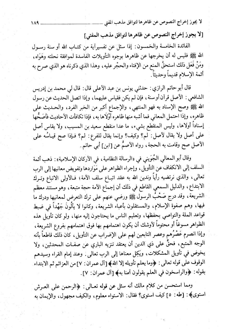 وَقَالَ أَبُو الْمَعَالِي الْجُوَيْنِيُّ فِي الرِّسَالَةِ النِّظَامِيَّةِ فِي الْأَرْكَانِ الْإِسْلَامِيَّةِ ": ذَهَبَ أَئِمَّةُ السَّلَفِ إلَى الِانْكِفَافِ عَنْ التَّأْوِيلِ، وَإِجْرَاءِ الظَّوَاهِرِ عَلَى مَوَارِدِهَا وَتَفْوِيضِ مَعَانِيهَا إلَى الرَّبِّ تَعَالَى، وَاَلَّذِي نَرْتَضِيهِ رَأْيًا وَنَدِينُ اللَّهَ بِهِ عَقْدَ اتِّبَاعِ سَلَفِ الْأُمَّةِ؛ فَالْأَوْلَى الِاتِّبَاعُ وَتَرْكُ الِابْتِدَاعِ، وَالدَّلِيلُ السَّمْعِيُّ الْقَاطِعُ فِي ذَلِكَ أَنَّ إجْمَاعَ الْأُمَّةِ حُجَّةٌ مُتَّبَعَةٌ، وَهُوَ مُسْتَنَدُ مُعْظَمِ الشَّرِيعَةِ، وَقَدْ دَرَجَ صَحْبُ الرَّسُولِ - صَلَّى اللَّهُ عَلَيْهِ وَسَلَّمَ - وَرَضِيَ عَنْهُمْ عَلَى تَرْكِ التَّعَرُّضِ لِمَعَانِيهَا وَدَرْكِ مَا فِيهَا، وَهُمْ صَفْوَةُ الْإِسْلَامِ، وَالْمُسْتَقِلُّونَ بِأَعْبَاءِ الشَّرِيعَةِ، وَكَانُوا لَا يَأْلُونَ جَهْدًا فِي ضَبْطِ قَوَاعِدِ الْمِلَّةِ وَالتَّوَاصِي بِحِفْظِهَا، وَتَعْلِيمِ النَّاسِ مَا يَحْتَاجُونَ إلَيْهِ مِنْهَا، وَلَوْ كَانَ تَأْوِيلُ هَذِهِ الظَّوَاهِرِ مَسُوغًا أَوْ مَحْتُومًا لَأَوْشَكَ أَنْ يَكُونَ اهْتِمَامُهُمْ بِهَا فَوْقَ اهْتِمَامِهِمْ بِفُرُوعِ الشَّرِيعَةِ، وَإِذَا انْصَرَمَ عَصْرُهُمْ وَعَصْرُ التَّابِعِينَ لَهُمْ عَلَى الْإِضْرَابِ عَنْ التَّأْوِيلِ، كَانَ ذَلِكَ قَاطِعًا بِأَنَّهُ الْوَجْهُ الْمُتَّبَعُ، فَحَقٌّ عَلَى ذِي الدِّينِ أَنْ يَعْتَقِدَ تَنْزِيهَ الْبَارِي عَنْ صِفَاتِ الْمُحَدِّثِينَ، وَلَا يَخُوضُ فِي تَأْوِيلِ الْمُشْكِلَاتِ، وَيَكِلُ مَعْنَاهَا إلَى الرَّبِّ تَعَالَى.