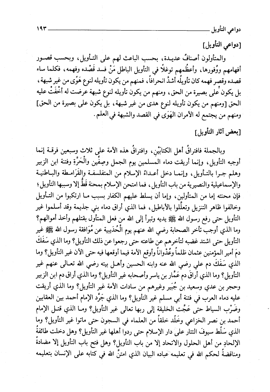 دَوَاعِي التَّأْوِيلِ] وَالْمُتَأَوِّلُونَ أَصْنَافٌ عَدِيدَةٌ، بِحَسَبِ الْبَاعِثِ لَهُمْ عَلَى التَّأْوِيلِ، وَبِحَسَبِ قُصُورِ أَفْهَامِهِمْ وَوُفُورِهَا، وَأَعْظَمُهُمْ تَوَغُّلًا فِي التَّأْوِيلِ الْبَاطِلِ مَنْ فَسَدَ قَصْدُهُ وَفَهْمُهُ، فَكُلَّمَا سَاءَ قَصْدُهُ وَقَصُرَ فَهْمُهُ كَانَ تَأْوِيلُهُ أَشَدَّ انْحِرَافًا، فَمِنْهُمْ مَنْ يَكُونُ تَأْوِيلُهُ لِنَوْعِ هَوًى مِنْ غَيْرِ شُبْهَةٍ، بَلْ يَكُونُ عَلَى بَصِيرَةٍ مِنْ الْحَقِّ، وَمِنْهُمْ مِنْ يَكُونُ تَأْوِيلُهُ لِنَوْعِ شُبْهَةٍ عَرَضَتْ لَهُ أَخْفَتْ عَلَيْهِ الْحَقَّ [وَمِنْهُمْ مَنْ يَكُونُ تَأْوِيلُهُ لِنَوْعِ هُدًى مِنْ غَيْرِ شُبْهَةٍ، بَلْ يَكُونُ عَلَى بَصِيرَةٍ مِنْ الْحَقِّ] وَمِنْهُمْ مَنْ يَجْتَمِعُ لَهُ الْأَمْرَانِ الْهَوَى فِي الْقَصْدِ وَالشُّبْهَةُ فِي الْعِلْمِ.
