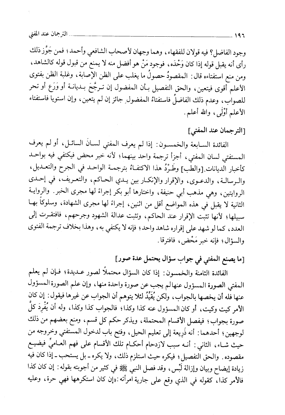 [التُّرْجُمَانُ عِنْدَ الْمُفْتِي] الْفَائِدَةُ السَّابِعَةُ وَالْخَمْسُونَ: إذَا لَمْ يَعْرِفْ الْمُفْتِي لِسَانَ السَّائِلِ، أَوْ لَمْ يَعْرِفْ الْمُسْتَفْتِي لِسَانَ الْمُفْتِي أَجْزَأَ تَرْجَمَةُ وَاحِدٍ بَيْنَهُمَا؛ لِأَنَّهُ خَبَرٌ مَحْضٌ فَيُكْتَفَى فِيهِ بِوَاحِدٍ كَأَخْبَارِ الدِّيَانَاتِ [وَالطِّبِّ] وَطَرْدُ هَذَا الِاكْتِفَاءِ بِتَرْجَمَةِ الْوَاحِدِ فِي الْجَرْحِ وَالتَّعْدِيلِ، وَالرِّسَالَةِ، وَالدَّعْوَى، وَالْإِقْرَارِ وَالْإِنْكَارِ بَيْنَ يَدَيْ الْحَاكِمِ، وَالتَّعْرِيفِ، فِي إحْدَى الرِّوَايَتَيْنِ، وَهِيَ مَذْهَبُ أَبِي حَنِيفَةَ، وَاخْتَارَهَا أَبُو بَكْرٍ إجْرَاءً لَهَا مَجْرَى الْخَبَرِ.