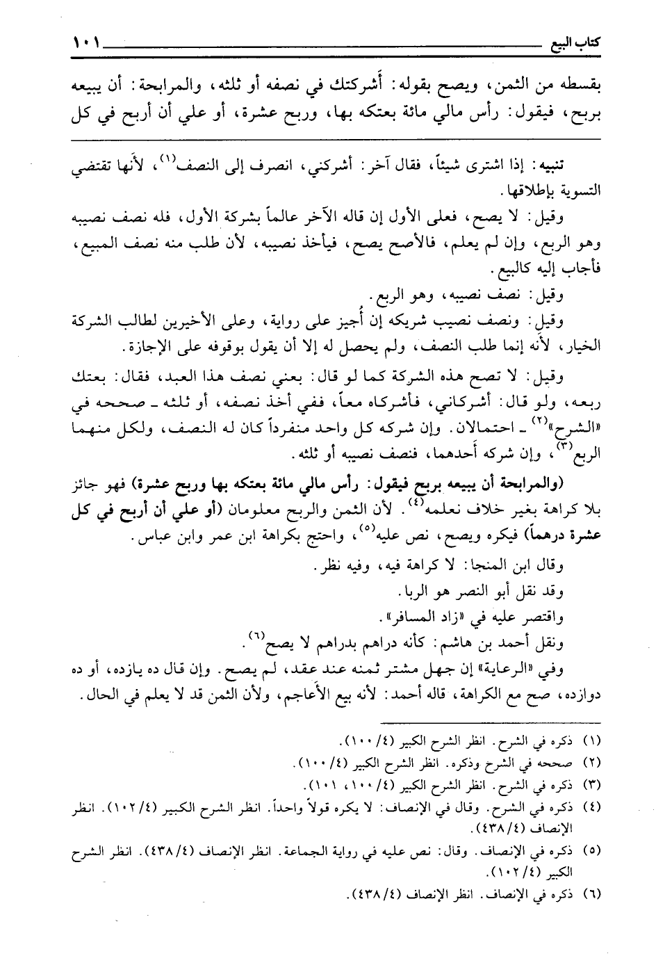 بِقِسْطِهِ مِنَ الثَّمَنِ، وَيَصِحُّ بِقَوْلِهِ: أَشْرَكْتُكَ فِي نِصْفِهِ، أَوْ ثُلُثِهِ، وَالْمُرَابَحَةُ: أَنْ يَبِيعَهُ بِرِبْحٍ فَيَقُولُ: رَأْسُ مَالِي فِيهِ مِائَةٌ بِعْتُكَهُ بِهَا وَرِبْحٌ عَشَرَةٌ، أَوْ عَلي أَنْ أَرْبَحَ فِي كُلِّ