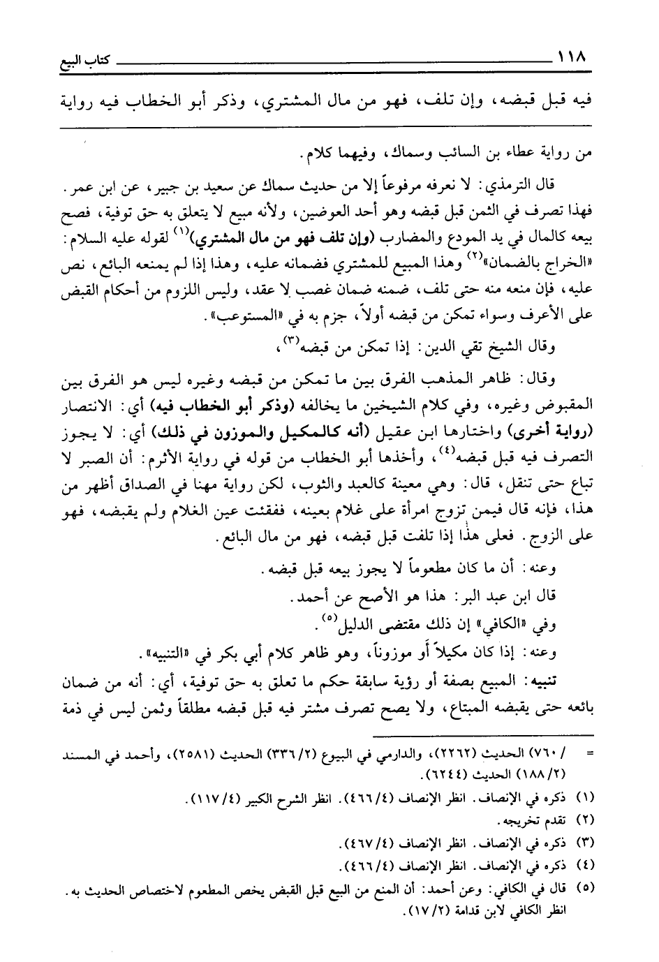 قَالَ التِّرْمِذِيُّ: لا نعرفه مَرْفُوعًا إِلَّا مِنْ حَدِيثِ سِمَاكٍ، عَنْ سَعِيدِ بْنِ جُبَيْرٍ، عَنِ ابْنِ عُمَرَ فَهَذَا تَصْرُّفٌ فِي الثَّمَنِ قَبْلَ قَبْضِهِ، وَهُوَ أَحَدُ الْعِوَضَيْنِ، وَلِأَنَّهُ مَبِيعٌ لَا يَتَعَلَّقُ بِهِ حَقُّ تَوْفِيَةٍ، فَصَحَّ بَيْعُهُ كَالْمَالِ فِي يَدِ الْمُودِعِ، وَالْمُضَارِبِ (وَإِنْ تَلِفَ فَهُوَ مِنْ مَالِ الْمُشْتَرِي) لِقَوْلِهِ - عَلَيْهِ السَّلَامُ -: «الْخَرَاجُ بِالضَّمَانِ» وَهَذَا الْمَبِيعُ لِلْمُشْتَرِي فَضَمَانُهُ عَلَيْهِ، وَهَذَا إِذَا لَمْ يَمْنَعْهُ الْبَائِعُ، نَصَّ عَلَيْهِ، فَإِنْ مَنَعَهُ مِنْهُ حَتَّى تَلِفَ ضَمِنَهُ ضَمَانَ غَصْبٍ لَا عَقْدٍ، وَلَيْسَ اللُّزُومُ مِنْ أَحْكَامِ الْقَبْضِ عَلَى الْأَعْرَفِ، وَسَوَاءٌ تَمَكَّنَ مِنْ قَبْضِهِ أَوْ لَا، جَزَمَ بِهِ فِي " الْمُسْتَوْعِبِ ".