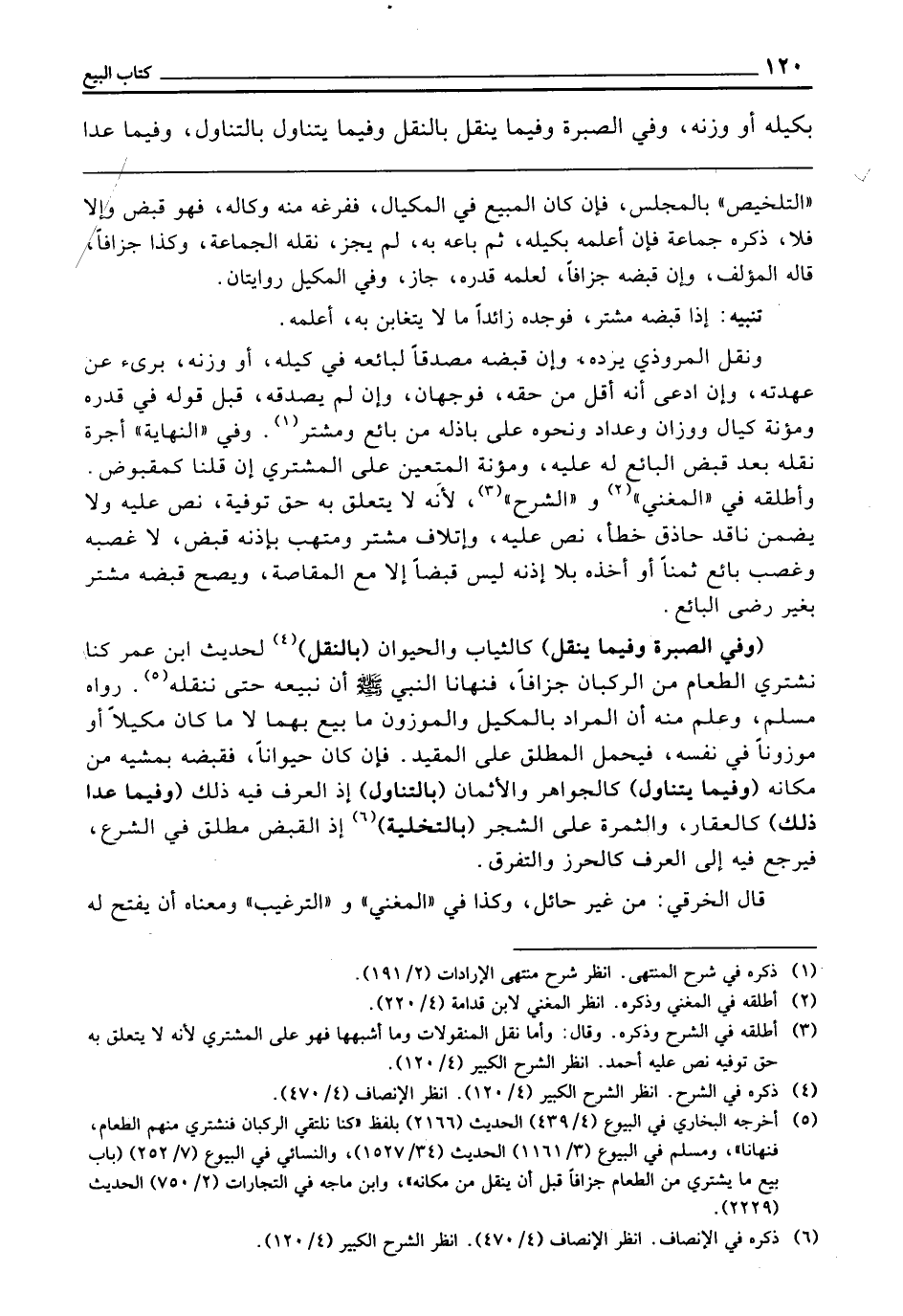 بِكَيْلِهِ أَوْ وَزْنِهِ، وَفِي الصُّبْرَةِ، وَفِيمَا يُنْقَلُ بِالنَّقْلِ، وَفِيمَا يُتَنَاوَلُ بِالتَّنَاوُلِ، وَفِيمَا عَدَا
