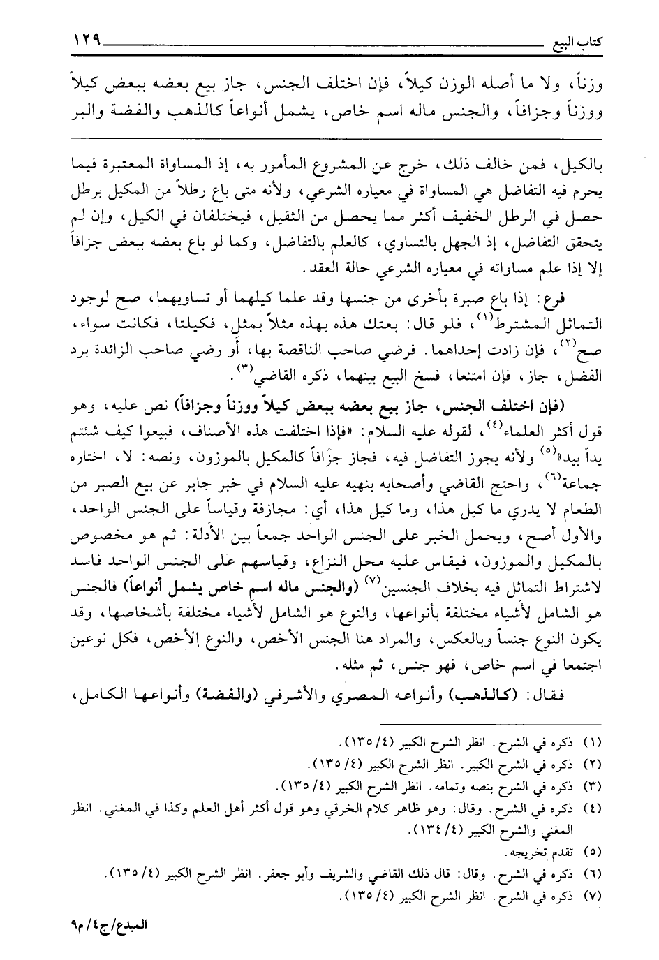 (فَإِنِ اخْتَلَفَ الْجِنْسُ جَازَ بَيْعُ بَعْضِهِ بِبَعْضٍ كَيْلًا وَوَزْنًا وَجُزَافًا) نَصَّ عَلَيْهِ، وَهُوَ قَوْلُ أَكْثَرِ الْعُلَمَاءِ لِقَوْلِهِ - عَلَيْهِ السَّلَامُ -: «فَإِذَا اخْتَلَفَتْ هَذِهِ الْأَصْنَافُ فَبِيعُوا كَيْفَ شِئْتُمْ يَدًا بِيَدٍ» ، وَلِأَنَّهُ يَجُوزُ التَّفَاضُلُ فِيهِ فَجَازَ جُزَافًا كَالْمَكِيلِ بِالْمَوْزُونِ وَنَصُّهُ: لَا، اخْتَارَهُ جَمَاعَةٌ وَاحْتَجَّ الْقَاضِي وَأَصْحَابُهُ بِنَهْيِهِ - عَلَيْهِ السَّلَامُ - فِي خَبَرِ جَابِرٍ عَنْ بَيْعِ الصُّبَرِ مِنَ الطَّعَامِ لَا يَدْرِي مَا كَيْلُ هَذَا، وَمَا كَيْلُ هَذَا، أَيْ: مُجَازَفَةً وَقِيَاسًا عَلَى الْجِنْسِ الْوَاحِدِ، وَالْأَوَّلُ أَصَحُّ، وَيُحْمَلُ الْخَبَرُ عَلَى الْجِنْسِ الْوَاحِدِ جَمْعًا بَيْنَ الْأَدِلَّةِ، ثُمَّ هُوَ مَخْصُوصٌ بِالْمَكِيلِ، وَالْمَوْزُونِ فَيُقَاسُ عَلَيْهِ مَحَلُّ النِّزَاعِ وَقِيَاسُهُمْ عَلَى الْجِنْسِ الْوَاحِدِ فَاسِدٌ لِاشْتِرَاطِ التَّمَاثُلِ فِيهِ بِخِلَافِ الْجِنْسَيْنِ (وَالْجِنْسُ مَا لَهُ اسْمٌ خَاصٌّ يَشْمَلُ أَنْوَاعًا) فَالْجِنْسُ هُوَ الشَّامِلُ لِأَشْيَاءَ مُخْتَلِفَةٍ بِأَنْوَاعِهَا، وَالنَّوْعُ هُوَ الشَّامِلُ لِأَشْيَاءَ مُخْتَلِفَةٍ بِأَشْخَاصِهَا، وَقَدْ يَكُونُ النَّوْعُ جِنْسًا وَبِالْعَكْسِ، وَالْمُرَادُ هُنَا الْجِنْسُ الْأَخَصُّ، وَالنَّوْعُ الْأَخَصُّ فَكُلُّ نَوْعَيْنِ اجْتَمَعَا فِي اسْمٍ خَاصٍّ فَهُوَ جِنْسٌ، ثُمَّ مَثَّلَهُ.