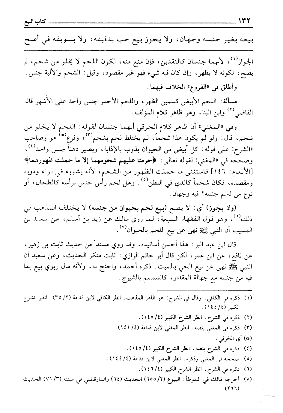 (وَلَا يَجُوزُ) أَيْ: لَا يَصِحُّ (بَيْعُ لَحْمٍ بِحَيَوَانٍ مِنْ جِنْسِهِ) لَا يَخْتَلِفُ الْمَذْهَبُ فِي ذَلِكَ، وَهُوَ قَوْلُ الْفُقَهَاءِ السَّبْعَةِ لِمَا رَوَى مَالِكٌ عَنْ زَيْدِ بْنِ أَسْلَمَ عَنْ سَعِيدِ بْنِ الْمُسَيَّبِ أَنَّ النَّبِيَّ - صَلَّى اللَّهُ عَلَيْهِ وَسَلَّمَ - «نَهَى عَنْ بَيْعِ اللَّحْمِ بِالْحَيَوَانِ» .