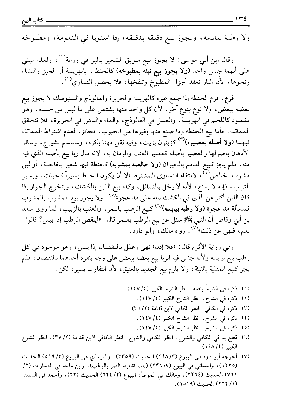 فَرْعٌ: فَرْعُ الْحِنْطَةِ إِذَا جَمَعَ غَيْرَهُ كَالْهَرِيسَةِ، وَالْحَرِيرَةِ، وَالْفَالُوذَجِ، وَالسَّنَبُوسَكُ لَا يَجُوزُ بَيْعُ بَعْضِهِ بِبَعْضٍ، وَلَا نَوْعٍ بِنَوْعٍ آخَرَ؛ لِأَنَّ كُلَّ وَاحِدٍ مِنْهَا يَشْتَمِلُ عَلَى مَا لَيْسَ مِنْ جِنْسِهِ، وَهُوَ مَقْصُودٌ كَاللَّحْمِ فِي الْهَرِيسَةِ، وَالْعَسَلِ فِي الْفَالُوذَجِ، وَالْمَاءِ وَالدُّهْنِ فِي الْحَرِيرَةِ، فَلَا تَتَحَقَّقُ الْمُمَاثَلَةُ فَأَمَّا بَيْعُ الْحِنْطَةِ، وَمَا صُنِعَ مِنْهَا بِغَيْرِهَا مِنَ الْحُبُوبِ فَجَائِزٌ لِعَدَمِ اشْتِرَاطِ الْمُمَاثَلَةِ فِيهِمَا (وَلَا أَصْلِهِ بِعَصِيرِهِ) كَزَيْتُونٍ بِزَيْتٍ - وَفِيهِ نَقَلَ مُهَنَّا يُكْرَهُ - وَسِمْسِمٍ بِشَيْرَجٍ وَسَائِرِ الْأَدْهَانِ بِأُصُولِهَا وَالْعَصِيرِ بِأَصْلِهِ كَعَصِيرِ الْعِنَبِ، وَالرُّمَّانِ بِهِ؛ لِأَنَّهُ مَالُ رِبًا بِيعَ بِأَصْلِهِ الَّذِي فِيهِ مِنْهُ، فَلَمْ يَجُزْ كَبَيْعِ اللَّحْمِ بِالْحَيَوَانِ (وَلَا خَالَصِهِ بِمَشُوبِهِ) كَحِنْطَةٍ فِيهَا شَعِيرٌ بِخَالِصَةٍ، أَوْ لَبَنٍ مَشُوبٍ بِخَالِصٍ لِانْتِفَاءِ التَّسَاوِي الْمُشْتَرَطِ، إِلَّا أَنْ يَكُونَ الْخَلْطُ يَسِيرًا كَحَبَّاتٍ وَيَسِيرِ التُّرَابِ، فَإِنَّهُ لَا يَمْنَعُ؛ لِأَنَّهُ لَا يُخِلُّ بِالتَّمَاثُلِ، وَكَذَا بَيْعُ اللَّبَنِ بِالْكَشْكِ، وَيَتَخَرَّجُ الْجَوَازُ إِذَا كَانَ اللَّبَنُ أَكْثَرَ مِنَ الَّذِي فِي الْكَشْكِ بِنَاءً عَلَى مُدِّ عَجْوَةٍ، وَلَا يَجُوزُ بَيْعُ الْمَشُوبِ بِالْمَشُوبِ كَمَسْأَلَةِ مُدِّ عَجْوَةٍ (وَلَا رَطْبِهِ بِيَابِسِهِ) كَبَيْعِ الرُّطَبِ بِالتَّمْرِ، وَالْعِنَبِ بِالزَّبِيبِ لِمَا رَوَى سَعْدُ بْنُ أَبِي وَقَّاصٍ أَنَّ النَّبِيَّ - صَلَّى اللَّهُ عَلَيْهِ وَسَلَّمَ - «سُئِلَ عَنْ بَيْعِ الرُّطَبِ بِالتَّمْرِ قَالَ: أَيَنْقُصُ الرُّطَبُ إِذَا يَبِسَ؟ قَالُوا: نَعَمْ فَنَهَى عَنْ ذَلِكَ» . رَوَاهُ مَالِكٌ، وَأَبُو دَاوُدَ.