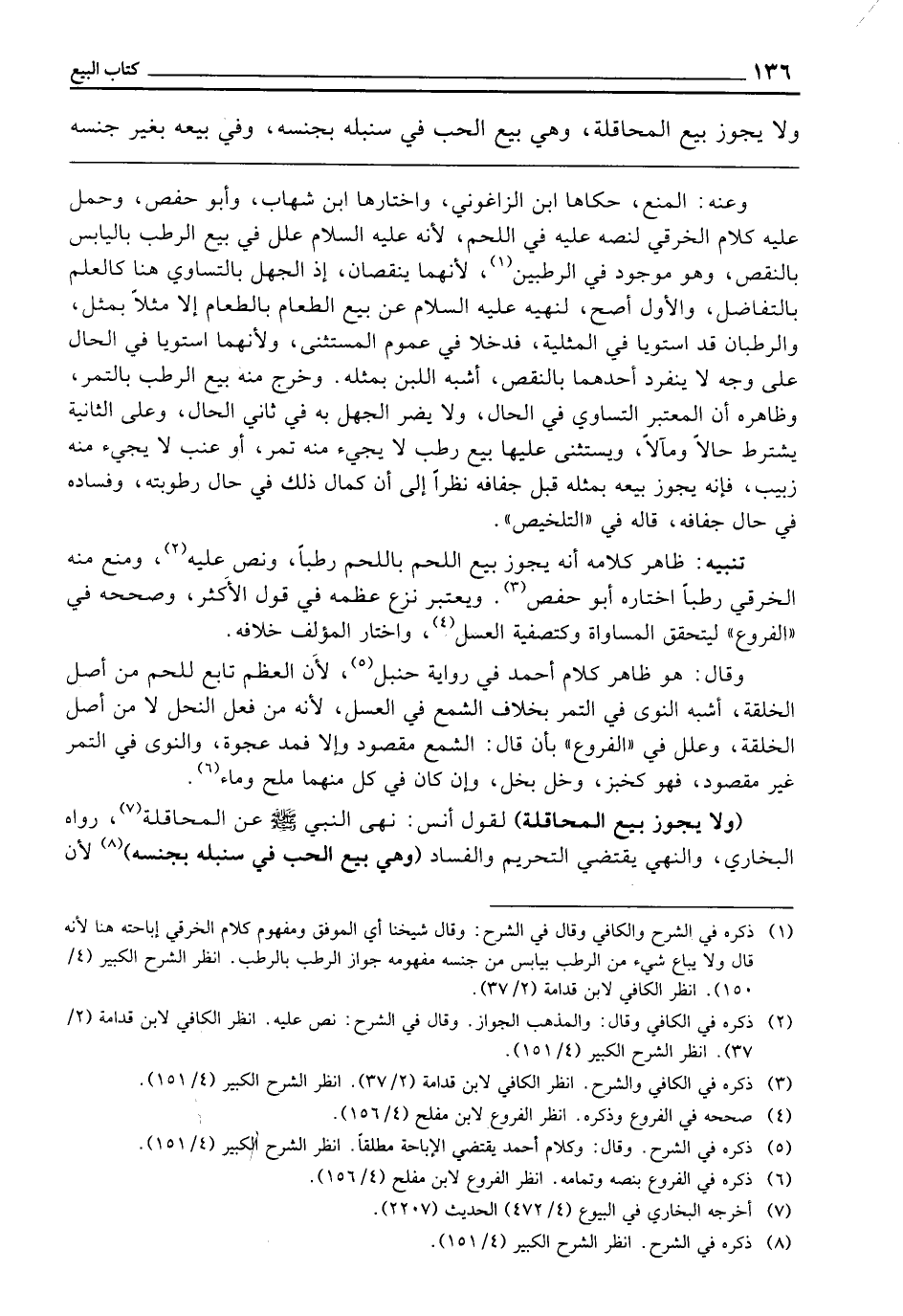 تَنْبِيهٌ: ظَاهِرُ كَلَامِهِ أَنَّهُ يَجُوزُ بَيْعُ اللَّحْمِ بِاللَّحْمِ رَطْبًا، وَنَصَّ عَلَيْهِ، وَمَنَعَ مِنْهُ الْخِرَقِيُّ رَطْبًا، اخْتَارَهُ أَبُو حَفْصٍ وَيُعْتَبَرُ نَزْعُ عَظْمِهِ فِي قَوْلِ الْأَكْثَرِ، وَصَحَّحَهُ فِي " الْفُرُوعِ " لِيَتَحَقَّقَ الْمُسَاوَاةُ وَكَتَصْفِيَةِ الْعَسَلِ، وَاخْتَارَ الْمُؤَلِّفُ خِلَافَهُ.