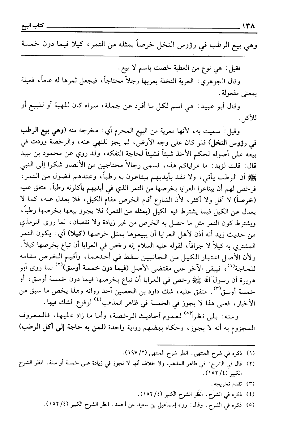 وَهِيَ بَيْعُ الرُّطَبِ فِي رُءُوسِ النَّخْلِ خَرْصًا بِمِثْلِهِ مِنَ التَّمْرِ كَيْلًا فِيمَا دُونَ خَمْسَةِ
