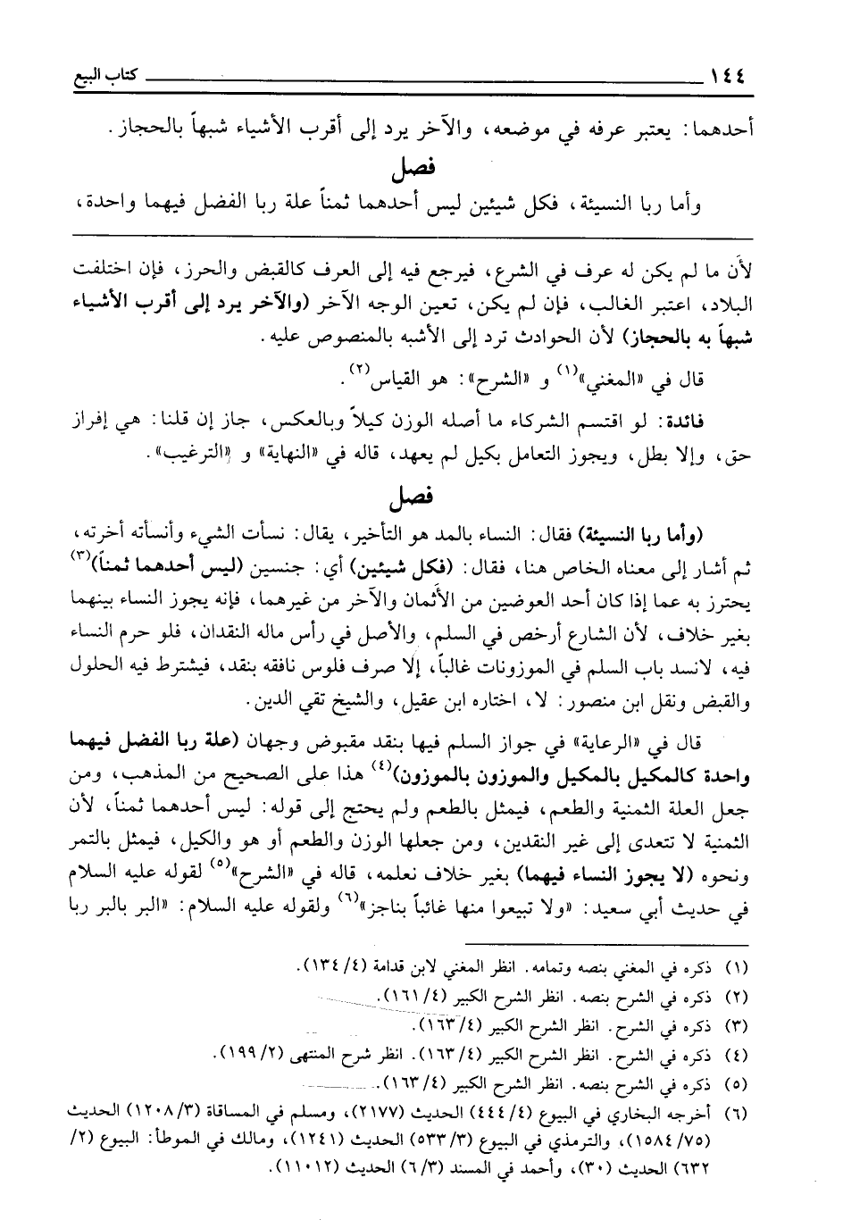 قَالَ فِي " الرِّعَايَةِ ": فِي جَوَازِ السَّلَمِ فِيهَا بِنَقْدٍ مَقْبُوضٍ وَجْهَانِ (عِلَّةُ رِبَا الْفَضْلِ فِيهِمَا وَاحِدَةٌ كَالْمَكِيلِ بِالْمَكِيلِ، وَالْمَوْزُونِ بِالْمَوْزُونِ) هَذَا عَلَى الصَّحِيحِ مِنَ الْمَذْهَبِ وَمَنْ جَعَلَ الْعِلَّةَ الثَّمَنِيَّةَ وَالطُّعْمَ، فَيُمَثِّلُ بِالطُّعْمِ، وَلَمْ يَحْتَجْ إِلَى قَوْلِهِ: لَيْسَ أَحَدُهُمَا ثَمَنًا؛ لِأَنَّ الثَّمَنِيَّةَ لَا تَتَعَدَّى إِلَى غَيْرِ النَّقْدَيْنِ وَمَنْ جَعَلَهَا الْوَزْنَ وَالطُّعْمَ، أَوْ هُوَ وَالْكَيْلَ، فَيُمَثِّلُ بِالتَّمْرِ وَنَحْوِهِ (لَا يَجُوزُ النَّسَاءُ فِيهِمَا) بِغَيْرِ خِلَافٍ نَعْلَمُهُ. قَالَهُ فِي " الشَّرْحِ " لِقَوْلِهِ - عَلَيْهِ السَّلَامُ -: فِي حَدِيثِ أَبِي سَعِيدٍ: «وَلَا تَبِيعُوا مِنْهَا غَائِبًا بِنَاجِزٍ» وَلِقَوْلِهِ - عَلَيْهِ السَّلَامُ -: «الْبُرُّ بِالْبُرِّ رِبًا
