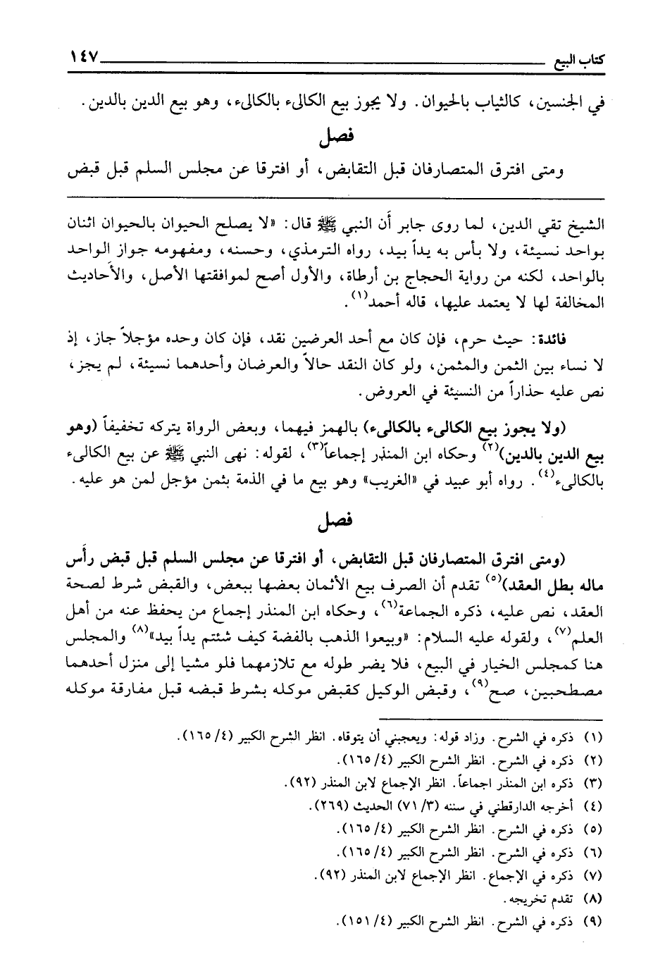 فَصْلٌ (وَمَتَّى افْتَرَقَ الْمُتَصَارِفَانِ قَبْلَ التَّقَابُضِ، أَوِ افْتَرَقَا عَنْ مَجْلِسِ السَّلَمِ قَبْلَ قَبْضِ رَأْسِ مَالِهِ بَطَلَ الْعَقْدُ) تَقَدَّمَ أَنَّ الصَّرْفَ بَيْعُ الْأَثْمَانِ بَعْضِهَا بِبَعْضٍ، وَالْقَبْضُ شَرْطٌ لِصِحَّةِ الْعَقْدِ، نَصَّ عَلَيْهِ، ذَكَرَهُ الْجَمَاعَةُ وَحَكَاهُ ابْنُ الْمُنْذِرِ إِجْمَاعَ مَنْ يُحْفَظُ عَنْهُ مِنْ أَهْلِ الْعِلْمِ وَلِقَوْلِهِ - عَلَيْهِ السَّلَامُ -: «وَبِيعُوا الذَّهَبَ بِالْفِضَّةِ كَيْفَ شِئْتُمْ يَدًا بِيَدٍ» . وَالْمَجْلِسُ هُنَا كَمَجْلِسِ الْخِيَارِ فِي الْبَيْعِ، فَلَا يَضُرُّ طُولُهُ مَعَ تَلَازُمِهِمَا، فَلَوْ مَشَيَا إِلَى مَنْزِلِ أَحَدِهِمَا مُصْطَحِبَيْنِ صَحَّ، وَقَبْضُ الْوَكِيلِ كَقَبْضِ مُوَكِّلِهِ بِشَرْطِ قَبْضِهِ قَبْلَ مُفَارَقَةِ مُوَكِّلِهِ