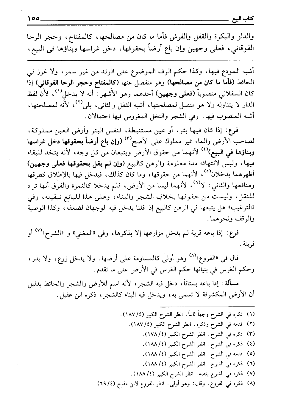 وَالدَّلْوِ، وَالْبَكَرَةِ، وَالْقُفْلِ، وَالْفَرْشِ، فَأَمَّا مَا كَانَ مِنْ مَصَالِحِهَا كَالْمِفْتَاحِ وَحَجَرِ الرَّحَا الْفَوْقَانِيِّ، فَعَلَى وَجْهَيْنِ، وَإِنْ بَاعَ أَرْضًا بِحُقُوقِهَا دَخَلَ غِرَاسُهَا وَبِنَاؤُهَا فِي الْبَيْعِ،