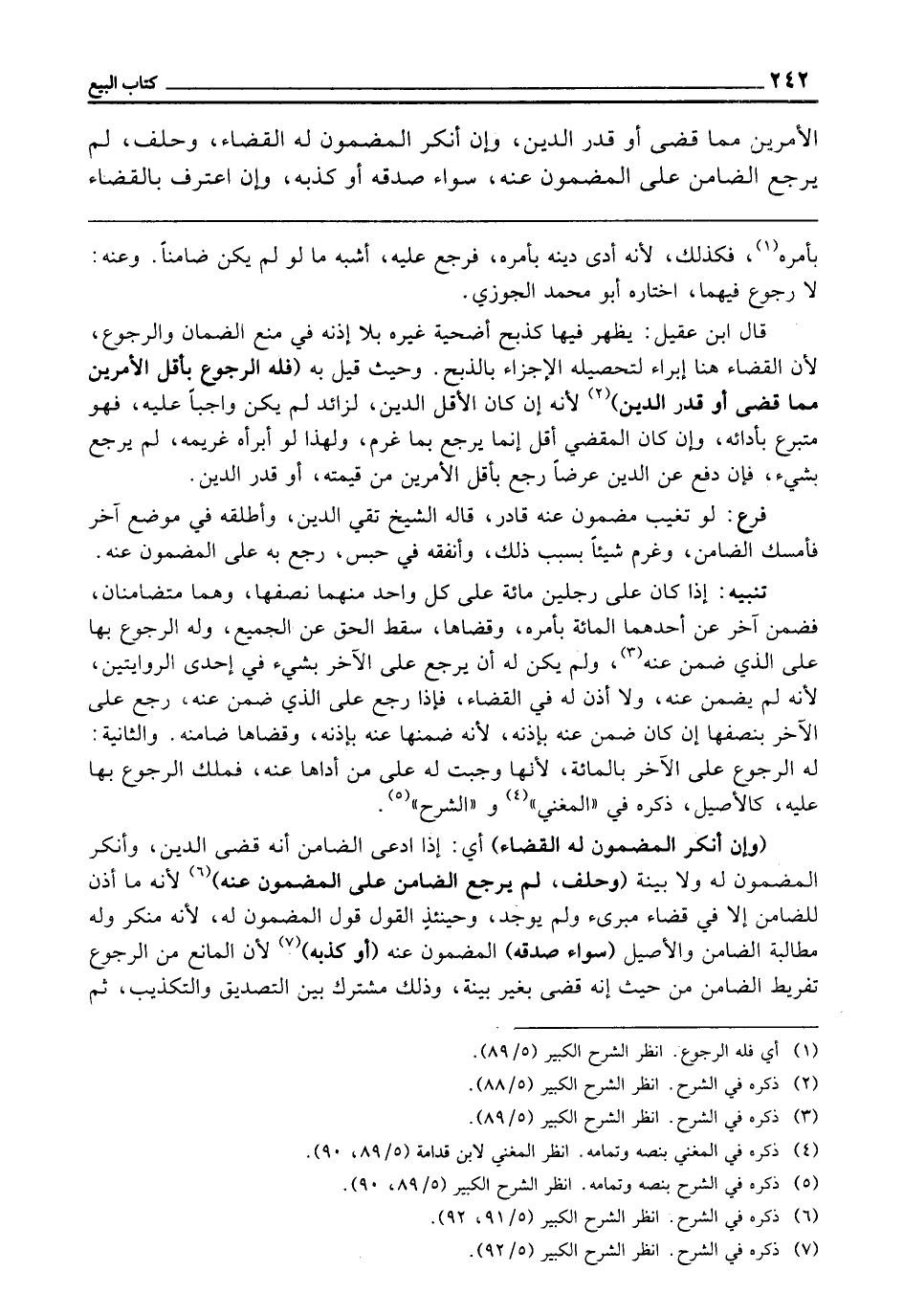 الْأَمْرَيْنِ مِمَّا قَضَى، أَوْ قُدِّرَ الدَّيْنُ وَإِنْ أَنْكَرَ الْمَضْمُونُ لَهُ الْقَضَاءَ وَحَلِفَ لَمْ يَرْجِعِ الضَّامِنُ عَلَى الْمَضْمُونِ عَنْهُ، سَوَاءٌ صَدَّقَهُ أَوْ كَذَّبَهُ، وَإِنِ اعْتَرَفَ بِالْقَضَاءِ،
