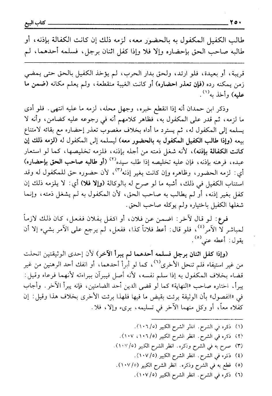 (وَإِذَا كُفِلَ اثْنَانِ بِرَجُلٍ فَسَلَّمَهُ أَحَدُهُمَا: لَمْ يَبْرَأِ الْآخَرُ) ، لِأَنَّ إِحْدَى الْوَثِيقَتَيْنِ انْحَلَّتِ من غير اسْتِيفَاءً، فَلَمْ تَنْحَلَّ الْأُخْرَى، كَمَا لَوْ أَبْرَأَ أَحَدُهُمَا، أَوِ انْفَكَّ أَحَدُ الرَّهْنَيْنِ مِنْ غَيْرِ قَضَاءٍ بِخِلَافِ الْمَكْفُولِ بِهِ إِذَا سَلَّمَ نَفْسَهُ، لِأَنَّهُ أَصْلٌ فَيَبْرَآنِ بِبَرَاءَتِهِ، لِأَنَّهُمَا فَرْعَاهُ، وَقِيلَ: يَبْرَأُ، اخْتَارَهُ صَاحِبُ " النِّهَايَةِ "، كَمَا لَوْ قَضَى الدَّيْنَ أَحَدُ الضَّامِنَيْنِ، فَإِنَّهُ يَبْرَأُ الْآخَرُ. أَجَابَ فِي " الْفُصُولِ " بِأَنَّ الْوَثِيقَةَ بَرِئَتْ بِقَبْضِ مَا فِيهَا فَلِهَذَا بَرِئَتِ الْأُخْرَى بِخِلَافِ هَذَا، وَقِيلَ: إِنْ كَفَلَاهُ مَعًا، أَوْ وَكَّلَ مِنْهُمَا الْآخَرَ فِي تَسْلِيمِهِ بَرِئَ، وَإِلَّا فَلَا.