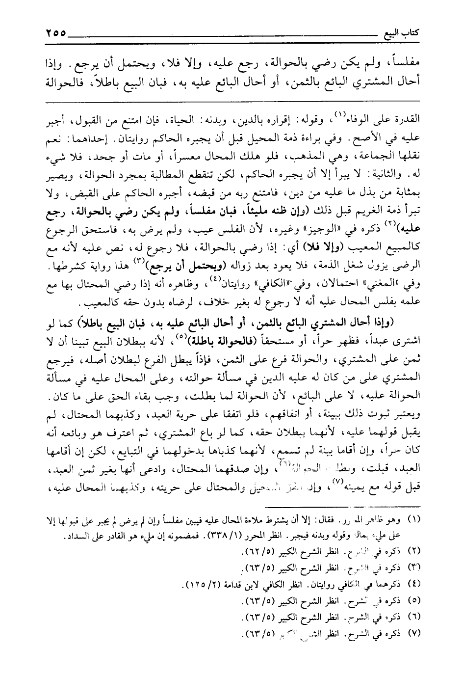 ـــــــــــــــــــــــــــــQالْقُدْرَةُ عَلَى الْوَفَاءِ، وَقَوْلُهُ: إِقْرَارُهُ بِالدَّيْنِ، وَبَدَنُهُ: الْحَيَاةُ، فَإِنِ امْتَنَعَ مِنَ الْقَبُولِ أُجْبِرَ عَلَيْهِ فِي الْأَصَحِّ، وَفِي بَرَاءَةِ ذِمَّةِ الْمُحِيلِ قَبْلَ أَنْ يُجْبِرَهُ الْحَاكِمُ رِوَايَتَانِ: إِحْدَاهُمَا: نَعَمْ نَقَلَهَا الْجَمَاعَةُ وَهِيَ الْمَذْهَبُ، فَلَوْ هَلَكَ الْمُحَالُ مُعْسِرًا، أَوْ مَاتَ، أَوْ جَحَدَ، فَلَا شَيْءَ لَهُ، وَالثَّانِيَةُ: لَا يَبْرَأُ إِلَّا أَنْ يُجْبِرَهُ الْحَاكِمُ، لَكِنْ تَنْقَطِعُ الْمُطَالَبَةُ بِمُجَرَّدِ الْحَوَالَةِ وَيَصِيرُ بِمَثَابَةِ مَنْ بَذَلَ مَا عَلَيْهِ مِنْ دَيْنٍ فَامْتَنَعَ رَبُّهُ مِنْ قَبْضِهِ أَجْبَرَهُ الْحَاكِمُ عَلَى الْقَبْضِ، وَلَا تَبْرَأُ ذِمَّةُ الْغَرِيمِ قَبْلَ ذَلِكَ (وَإِنْ ظَنَّهُ مليئا فبان مُفْلِسًا، وَلَمْ يَكُنْ رَضِيَ بِالْحَوَالَةِ رَجَعَ عَلَيْهِ) ، ذَكَرَهُ فِي " الْوَجِيزِ "، وَغَيْرِهِ، لِأَنَّ الْفَلَسَ عَيْبٌ، وَلَمْ يَرْضَ بِهِ فَاسْتَحَقَّ الرُّجُوعَ كَالْمَبِيعِ الْمَعِيبِ (وَإِلَّا فَلَا) أَيْ: إِذَا رَضِيَ بِالْحَوَالَةِ، فَلَا رُجُوعَ لَهُ، نَصَّ عَلَيْهِ، لِأَنَّهُ مَعَ الرِّضَا يَزُولُ شَغْلُ الذِّمَّةِ، فَلَا يَعُودُ بَعْدَ زَوَالِهِ (وَيُحْتَمَلُ أَنْ يَرْجِعَ) هَذَا رِوَايَةٌ كَشَرْطِهَا، وَفِي " الْمُغْنِي " احْتِمَالَانِ، وَفِي " الْكَافِي " رِوَايَتَانِ، وَظَاهِرُهُ أَنَّهُ إِذَا رَضِيَ الْمُحْتَالُ بِهَا مَعَ عِلْمِهِ بِفَلَسِ الْمُحَالِ عَلَيْهِ أَنَّهُ لَا رُجُوعَ لَهُ بِغَيْرِ خِلَافٍ لِرِضَاهُ بِدُونِ حَقِّهِ كَالْمَعِيبِ.