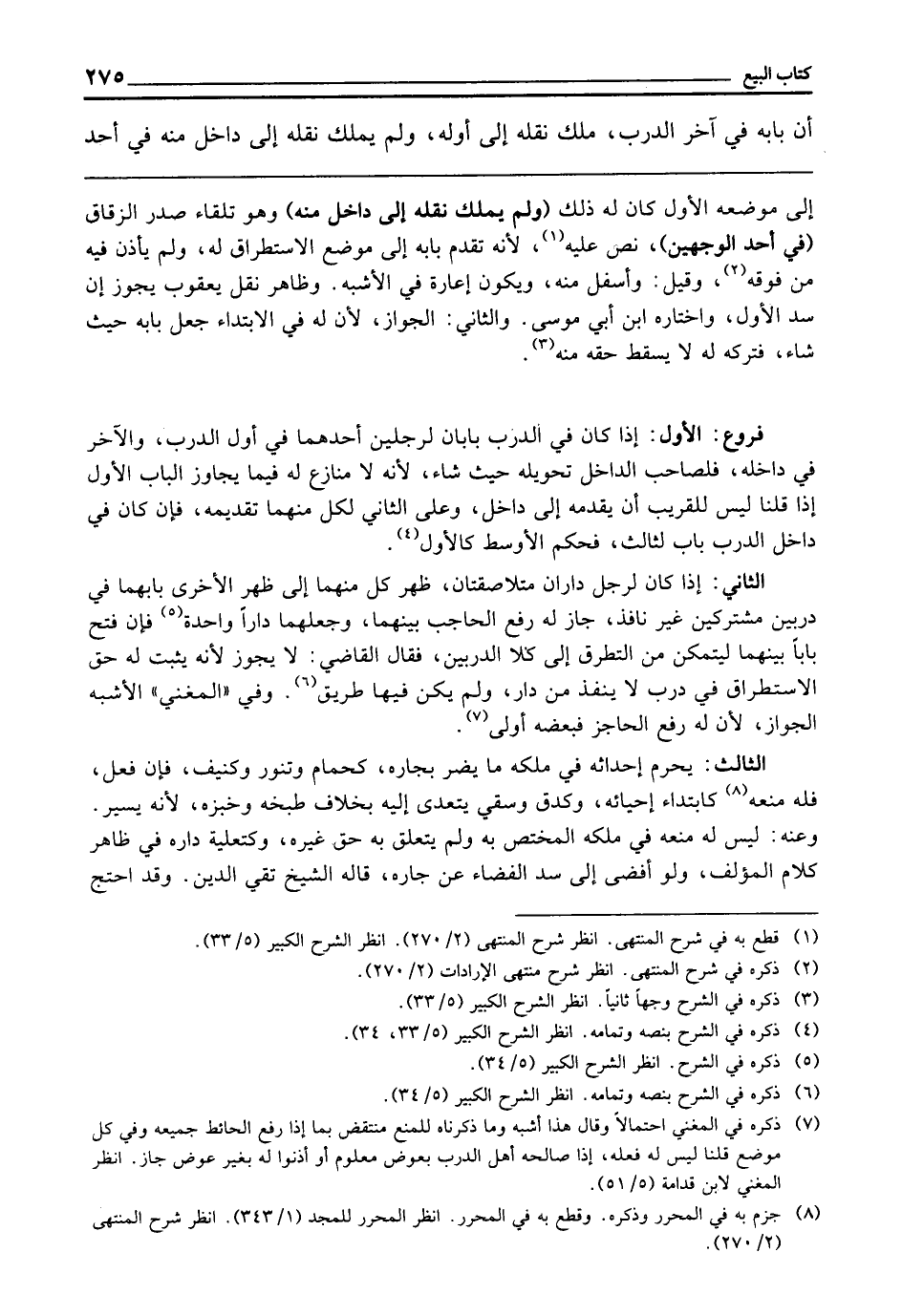 الثَّانِي: إِذَا كَانَ لِرَجُلٍ دَارَانِ مُتَلَاصِقَتَانِ ظَهْرُ كُلٍّ مِنْهُمَا إِلَى ظَهْرِ الْأُخْرَى بَابُهُمَا فِي دَرْبَيْنِ مُشْتَرِكَيْنِ غَيْرِ نَافِذٍ جَازَ لَهُ رَفْعُ الْحَاجِبِ بَيْنَهُمَا وَجَعْلُهُمَا دَارًا وَاحِدَةً، فَإِنْ فَتَحَ بَابًا بَيْنَهُمَا لِيَتَمَكَّنَ مِنَ التَّطَرُّقِ إِلَى كِلَا الدَّرْبَيْنِ فَقَالَ الْقَاضِي: لَا يَجُوزُ، لِأَنَّهُ يَثْبُتُ لَهُ حَقُّ الِاسْتِطْرَاقِ فِي دَرْبٍ لَا يَنْفُذُ مِنْ دَارٍ، وَلَمْ يَكُنْ فِيهَا طَرِيقٌ، وَفِي " الْمُغْنِي " الْأَشْبَهُ الْجَوَازُ، لِأَنَّ لَهُ رَفْعَ الْحَاجِزِ فَبَعْضُهُ أَوْلَى.