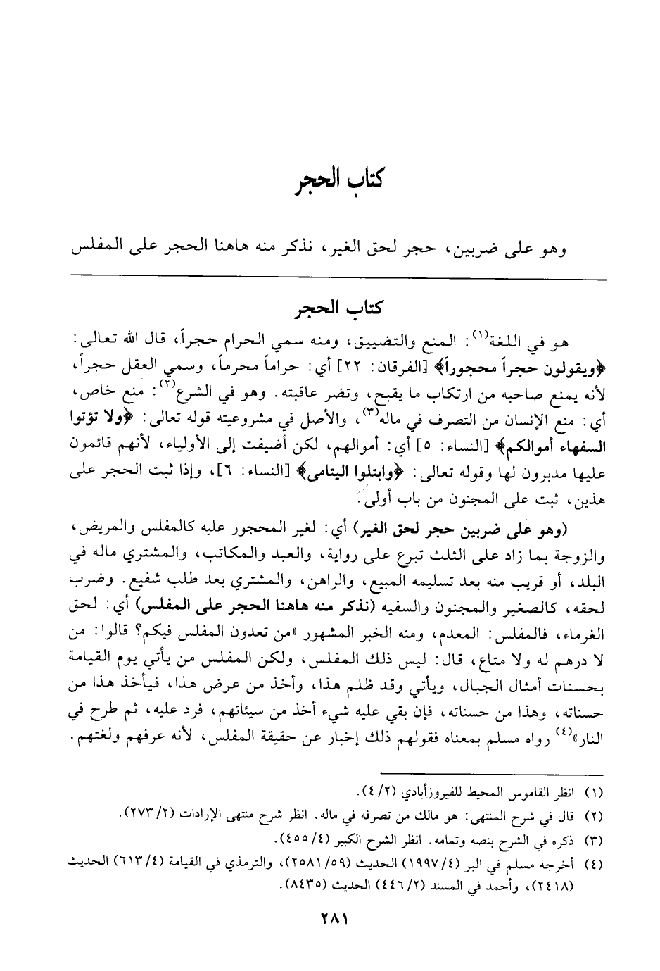 (وَهُوَ عَلَى ضَرْبَيْنِ: حَجْرٌ لِحَقِّ الْغَيْرِ) أَيْ: لِغَيْرِ الْمَحْجُورِ عَلَيْهِ كَالْمُفْلِسِ، وَالْمَرِيضِ، وَالزَّوْجَةِ بِمَا زَادَ عَلَى الثُّلُثِ تَبَرُّعٍ عَلَى رِوَايَةٍ، وَالْعَبْدِ، وَالْمُكَاتَبِ، وَالْمُشْتَرِي مَالُهُ فِي الْبَلَدِ، أَوْ قَرِيبٌ مِنْهُ بَعْدَ تَسْلِيمِهِ الْمَبِيعَ، وَالرَّاهِنِ، وَالْمُشْتَرِي بَعْدَ طَلَبِ شَفِيعٍ. وَضُرِبَ لِحَقِّهِ، كَالصَّغِيرِ، وَالْمَجْنُونِ، وَالسَّفِيهِ (نَذْكُرُ مِنْهُ هَاهُنَا الْحَجْرَ عَلَى الْمُفْلِسِ) أَيْ: لِحَقِّ الْغُرَمَاءِ فَالْمُفْلِسُ: الْمُعْدِمُ وَمِنْهُ الْخَبَرُ الْمَشْهُورُ: «مَنْ تَعُدُّونَ الْمُفْلِسَ فِيكُمْ؟ قَالُوا: مَنْ لَا دِرْهَمَ لَهُ، وَلَا مَتَاعَ قَالَ: لَيْسَ ذَلِكَ الْمُفْلِسَ، وَلَكِنَّ الْمُفْلِسَ مَنْ يَأْتِي يَوْمَ الْقِيَامَةِ بِحَسَنَاتٍ أَمْثَالِ الْجِبَالِ وَيَأْتِي، وَقَدْ ظَلَمَ هَذَا وَأَخَذَ مِنْ عِرْضِ هَذَا فَيَأْخُذُ هَذَا مِنْ حَسَنَاتِهِ، وَهَذَا مِنْ حَسَنَاتِهِ فَإِنْ بَقِيَ عَلَيْهِ شَيْءٌ أُخِذَ مِنْ سَيِّئَاتِهِمْ فَرُدَّ عَلَيْهِ، ثُمَّ طُرِحَ فِي النَّارِ» . رَوَاهُ مُسْلِمٌ بِمَعْنَاهُ. فَقَوْلُهُمْ ذَلِكَ إِخْبَارٌ عَنْ حَقِيقَةِ الْمُفْلِسِ، لِأَنَّهُ عُرْفُهُمْ وَلُغَتُهُمْ.
