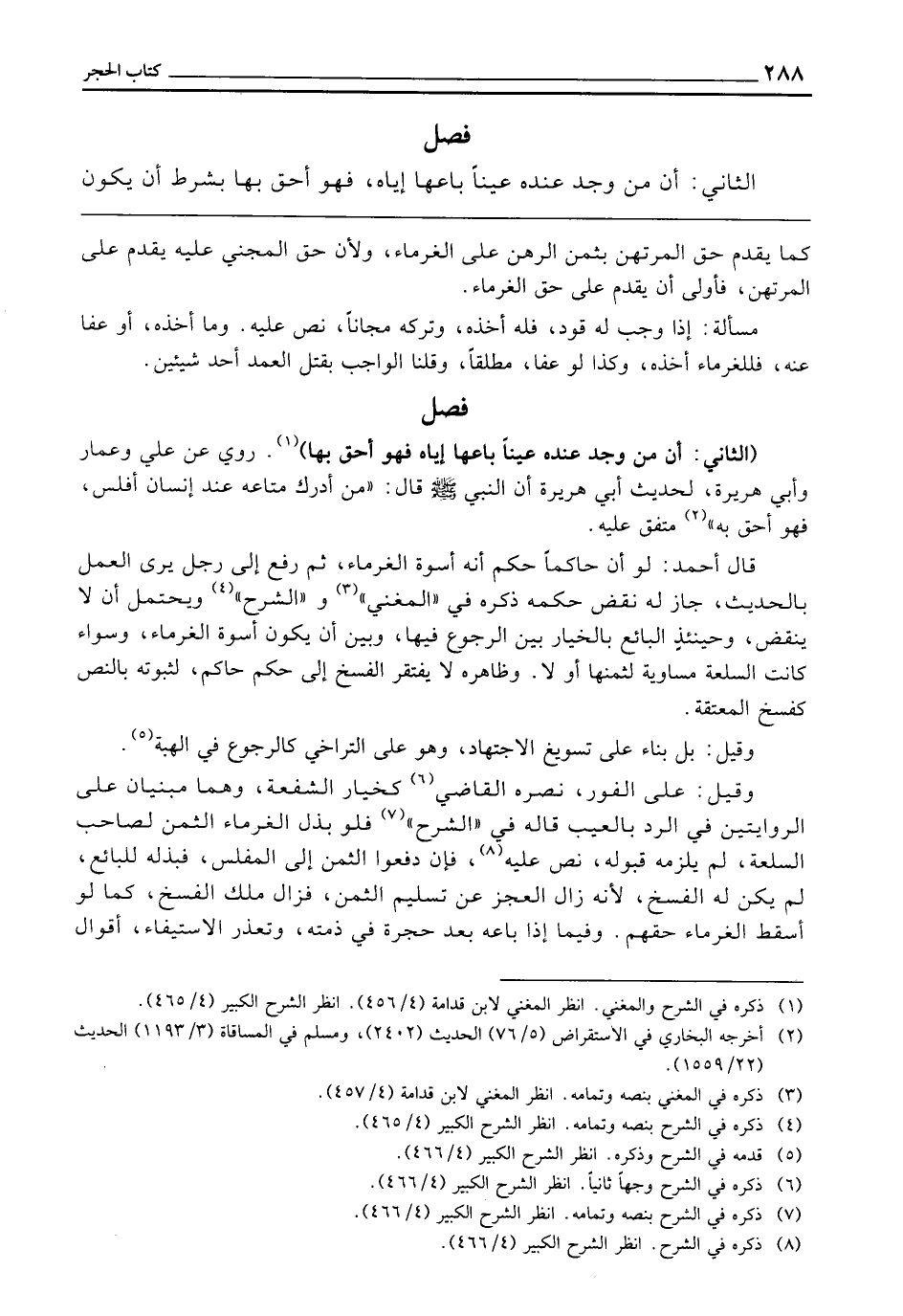 فَصْلٌ (الثَّانِي: أَنَّ مَنْ وَجَدَ عِنْدَهُ عَيْنًا بَاعَهَا إِيَّاهُ فَهُوَ أَحَقُّ بِهَا) ، رُوِيَ عَنْ عَلِيٍّ، وَعَمَّارٍ، وَأَبِي هُرَيْرَةَ لِحَدِيثِ أَبِي هُرَيْرَةَ أَنَّ النَّبِيَّ - صَلَّى اللَّهُ عَلَيْهِ وَسَلَّمَ - قَالَ: «مَنْ أَدْرَكَ مَتَاعَهُ عِنْدَ إِنْسَانٍ أَفْلَسَ فَهُوَ أَحَقُّ بِهِ» . مُتَّفَقٌ عَلَيْهِ.