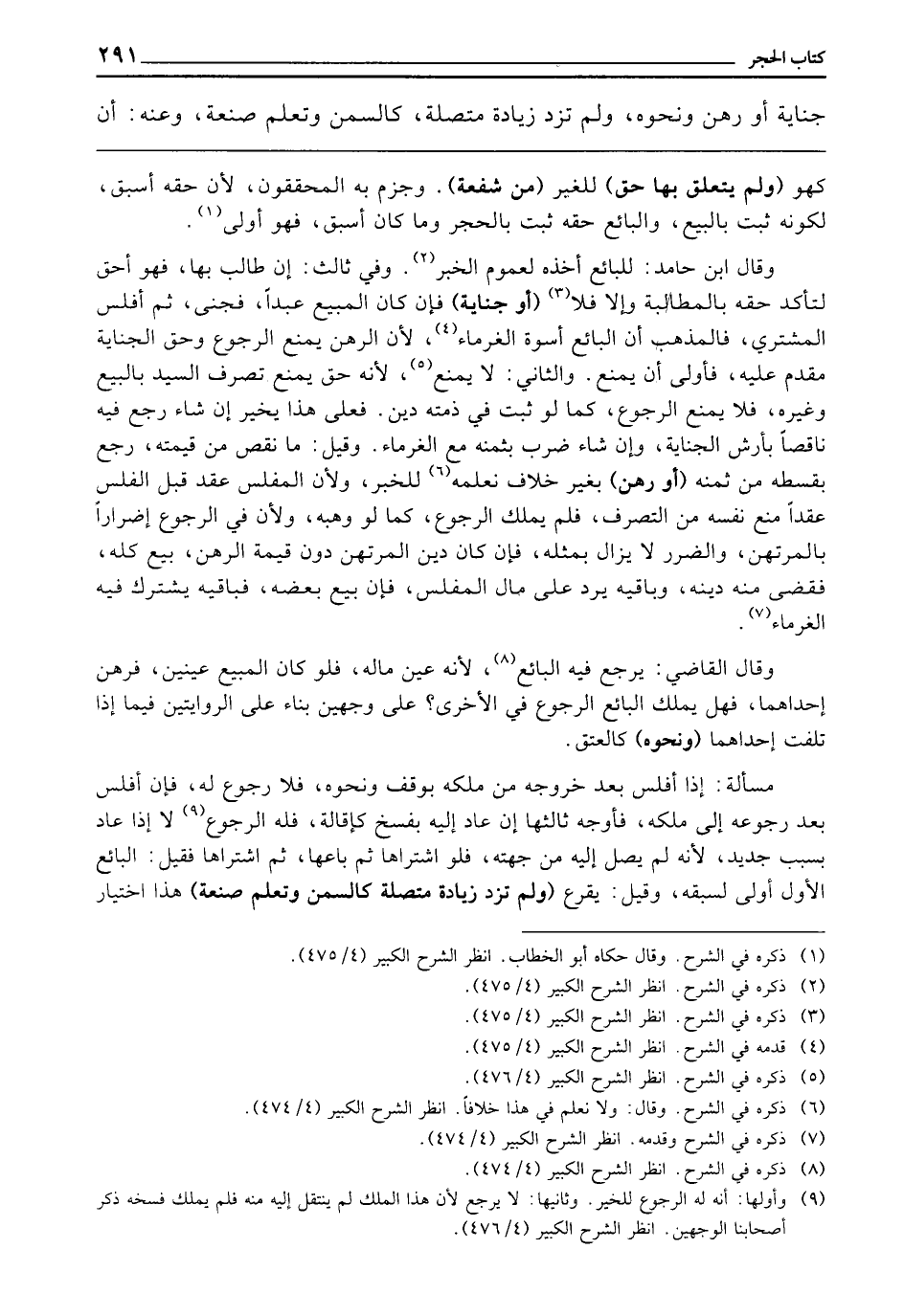 ـــــــــــــــــــــــــــــQكَهُوَ (وَلَمْ يَتَعَلَّقْ بِهَا حَقٌّ) لِلْغَيْرِ (مِنْ شُفْعَةٍ) ، وَجَزَمَ بِهِ الْمُحَقِّقُونَ، لِأَنَّ حَقَّهُ أَسْبَقُ لِكَوْنِهِ ثَبَتَ بِالْبَيْعِ، وَالْبَائِعُ حَقُّهُ ثَبَتَ بِالْحَجْرِ، وَمَا كَانَ أَسْبَقَ فَهُوَ أَوْلَى.