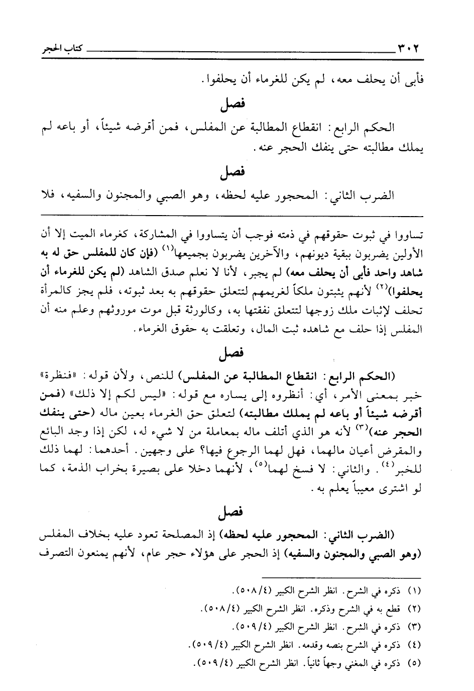 فَصْلٌ الْحُكْمُ الرَّابِعُ: انْقِطَاعُ الْمُطَالَبَةِ عَنِ الْمُفْلِسِ فَمَنْ أَقْرَضَهُ شَيْئًا، أَوْ بَاعَهُ لَمْ يَمْلِكِ الْمُطَالَبَةَ حَتَّى يَنْفَكَّ الْحَجْرُ عَنْهُ.