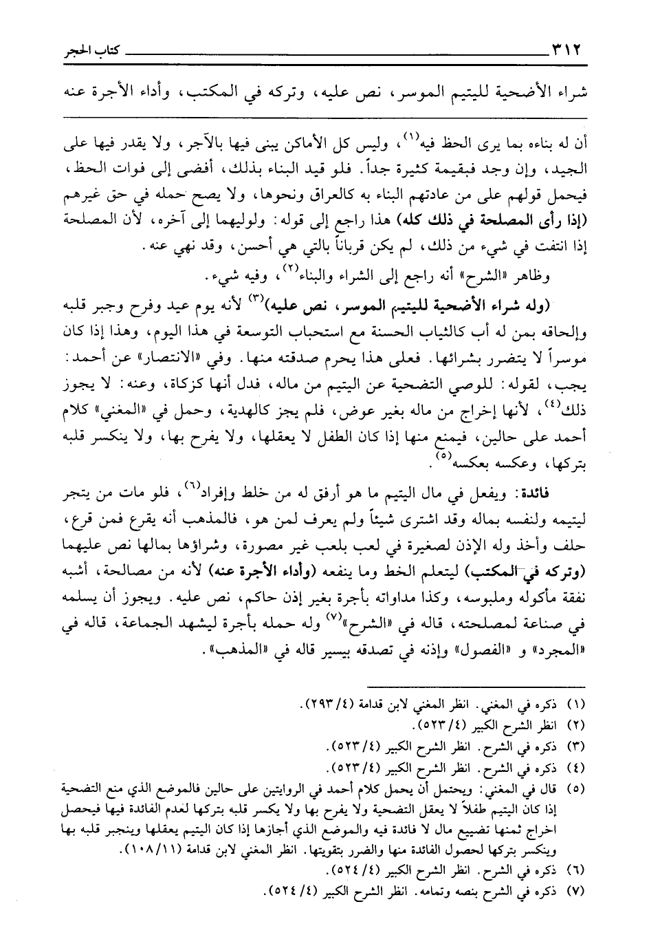 شِرَاءُ الْأُضْحِيَّةِ لِلْيَتِيمِ الْمُوسِرِ، نَصَّ عَلَيْهِ، وَتَرْكُهُ فِي الْمَكْتَبِ وَأَدَاءُ الْأُجْرَةِ عَنْهُ