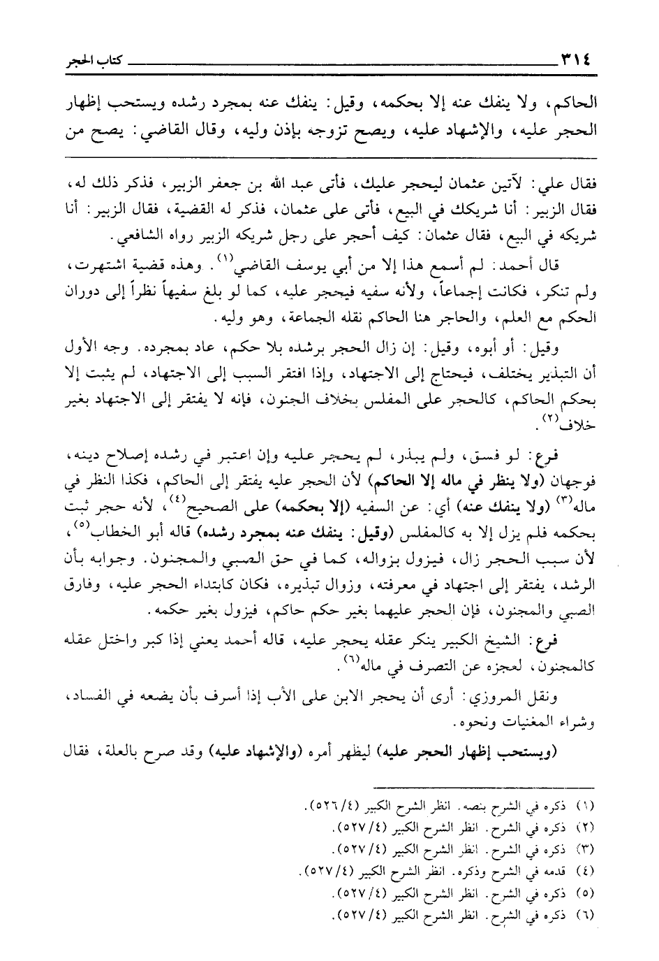 الْحَاكِمُ، وَلَا يَنْفَكُّ عَنْهُ إِلَّا بِحُكْمِهِ، وَقِيلَ: يَنْفَكُّ عَنْهُ بِمُجَرَّدِ رُشْدِهِ وَيُسْتَحَبُّ إِظْهَارُ الْحَجْرِ عَلَيْهِ، وَالْإِشْهَادُ عَلَيْهِ وَيَصِحُّ تَزَوُّجُهُ بِإِذْنِ وَلَيِّهِ، وَقَالَ الْقَاضِي: يَصِحُّ من