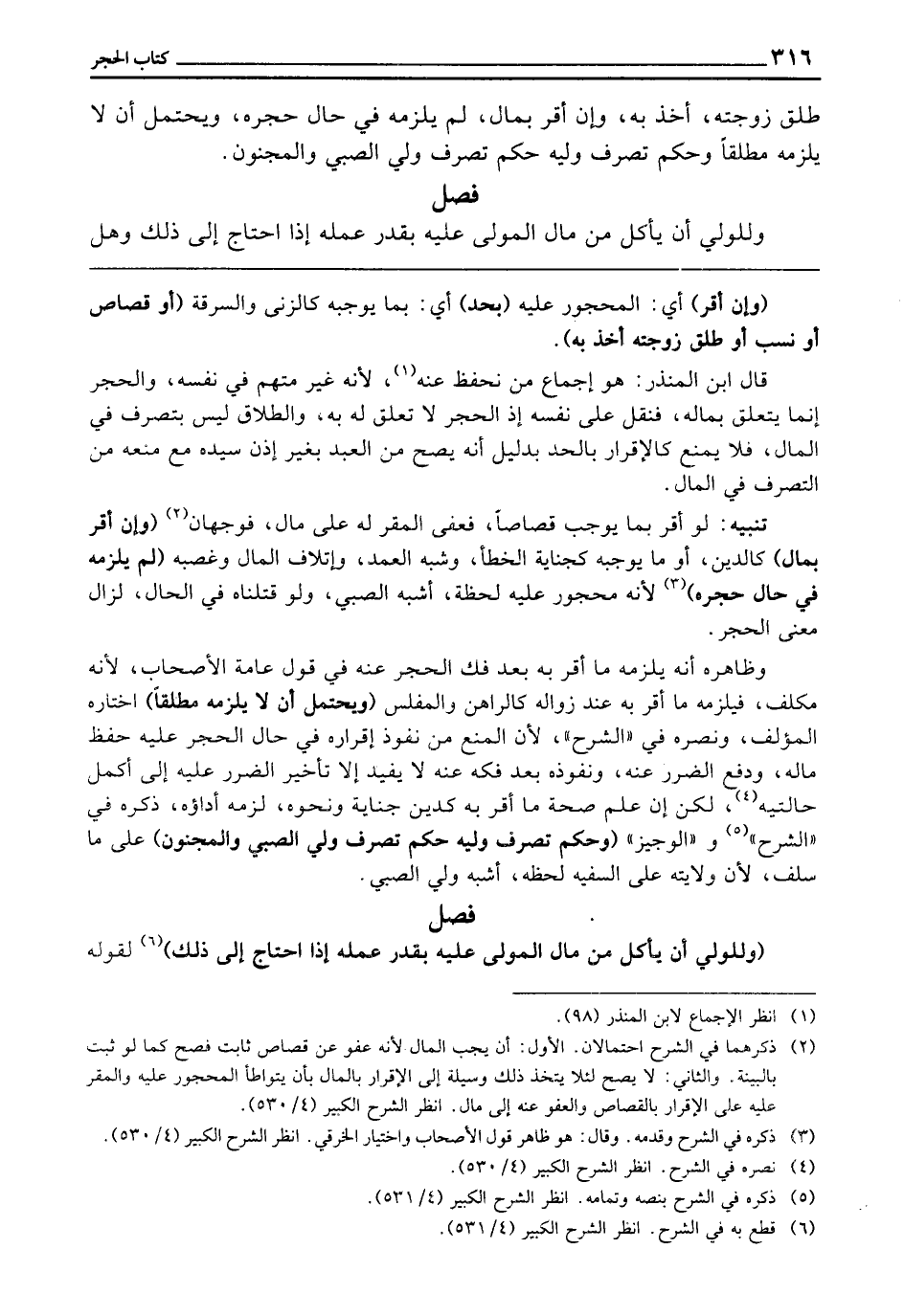 وَظَاهِرُهُ أَنَّهُ يَلْزَمُهُ مَا أَقَرَّ بِهِ بَعْدَ فَكِّ الْحَجْرِ عَنْهُ فِي قَوْلِ عَامَّةِ الْأَصْحَابِ، لِأَنَّهُ مُكَلَّفٌ فَيَلْزَمُهُ مَا أَقَرَّ بِهِ عِنْدَ زَوَالِهِ كَالرَّاهِنِ، وَالْمُفْلِسِ (وَيُحْتَمَلُ أَنْ لَا يَلْزَمَهُ مُطْلَقًا) ، اخْتَارَهُ الْمُؤَلِّفُ وَنَصَرَهُ فِي " الشَّرْحِ "، لِأَنَّ الْمَنْعَ مِنْ نُفُوذِ إِقْرَارِهِ فِي حَالِ الْحَجْرِ عَلَيْهِ حِفْظُ مَالِهِ وَدَفْعُ الضَّرَرِ عَنْهُ، وَنُفُوذُهُ بَعْدَ فَكِّهِ عَنْهُ لَا يُفِيدُ إِلَّا تَأْخِيرَ الضَّرَرِ عَلَيْهِ إِلَى أَكْمَلِ حَالَتَيْهِ، لَكِنْ إِنْ عَلِمَ صِحَّةَ مَا أَقَرَّ بِهِ كَدَيْنِ جِنَايَةٍ وَنَحْوِهِ لَزِمَهُ أَدَاؤُهُ، ذَكَرَهُ فِي " الشَّرْحِ "، وَ " الْوَجِيزِ " (وَحُكْمُ تَصَرُّفِ وَلِيِّهِ حُكْمُ تَصَرُّفِ وَلِيِّ الصَّبِيِّ، وَالْمَجْنُونِ) عَلَى مَا سَلَفَ، لِأَنَّ وِلَايَتَهُ عَلَى السَّفِيهِ لِحَظِّهِ، أَشْبَهَ وَلِيَّ الصَّبِيِّ.