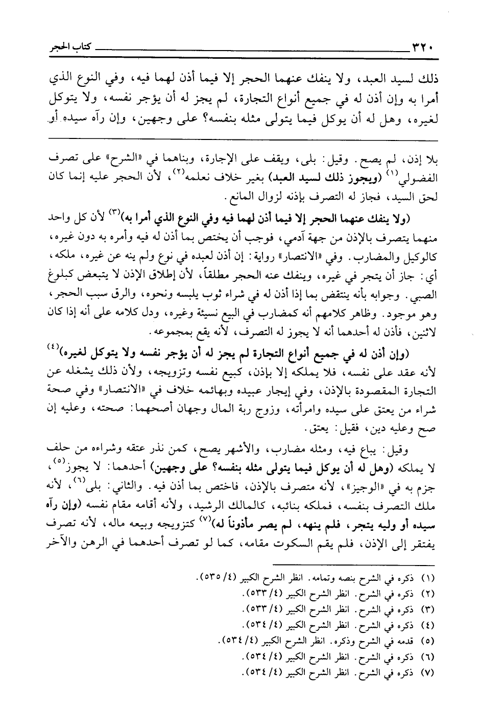 (وَلَا يَنْفَكُّ عَنْهُمَا الْحَجْرُ إِلَّا فِيمَا أُذِنَ لَهُمَا فِيهِ، وَفِي النَّوْعِ الَّذِي أُمِرَا بِهِ) ، لِأَنَّ كُلَّ وَاحِدٍ مِنْهُمَا يَتَصَرَّفُ بِالْإِذْنِ مِنْ جِهَةِ آدَمِيٍّ، فَوَجَبَ أَنْ يَخْتَصَّ بِمَا أَذِنَ لَهُ فِيهِ وَأَمَرَهُ بِهِ دُونَ غَيْرِهِ كَالْوَكِيلِ، وَالْمُضَارِبِ، وَفِي " الِانْتِصَارِ " رِوَايَةٌ: إِنْ أَذِنَ لِعَبْدِهِ فِي نَوْعٍ، وَلَمْ يَنْهَ عَنْ غَيْرِهِ مَلَكَهُ أَيْ: جَازَ أَنْ يَتَّجِرَ فِي غَيْرِهِ وَيَنْفَكَّ عَنْهُ الْحَجْرُ مُطْلَقًا، لِأَنَّ إِطْلَاقَ الْإِذْنِ لَا يَتَبَعَّضُ كَبُلُوغِ الصَّبِيِّ، وَجَوَابُهُ بِأَنَّهُ يُنْتَقَضُ بِمَا إِذَا أَذِنَ لَهُ فِي شِرَاءِ ثَوْبٍ يَلْبَسُهُ وَنَحْوِهِ، وَالرِّقُّ سَبَبُ الْحَجْرِ، وَهُوَ مَوْجُودٌ، وَظَاهِرُ كَلَامِهِمْ أَنَّهُ كَمُضَارِبٍ فِي الْبَيْعِ نَسِيئَةً، وَغَيْرِهِ، وَدَلَّ كَلَامُهُ عَلَى أَنَّهُ إِذَا كَانَ لِاثْنَيْنِ فَأَذِنَ لَهُ أَحَدُهُمَا، أَنَّهُ لَا يَجُوزُ لَهُ التَّصَرُّفُ، لِأَنَّهُ يَقَعُ بِمَجْمُوعِهِ.