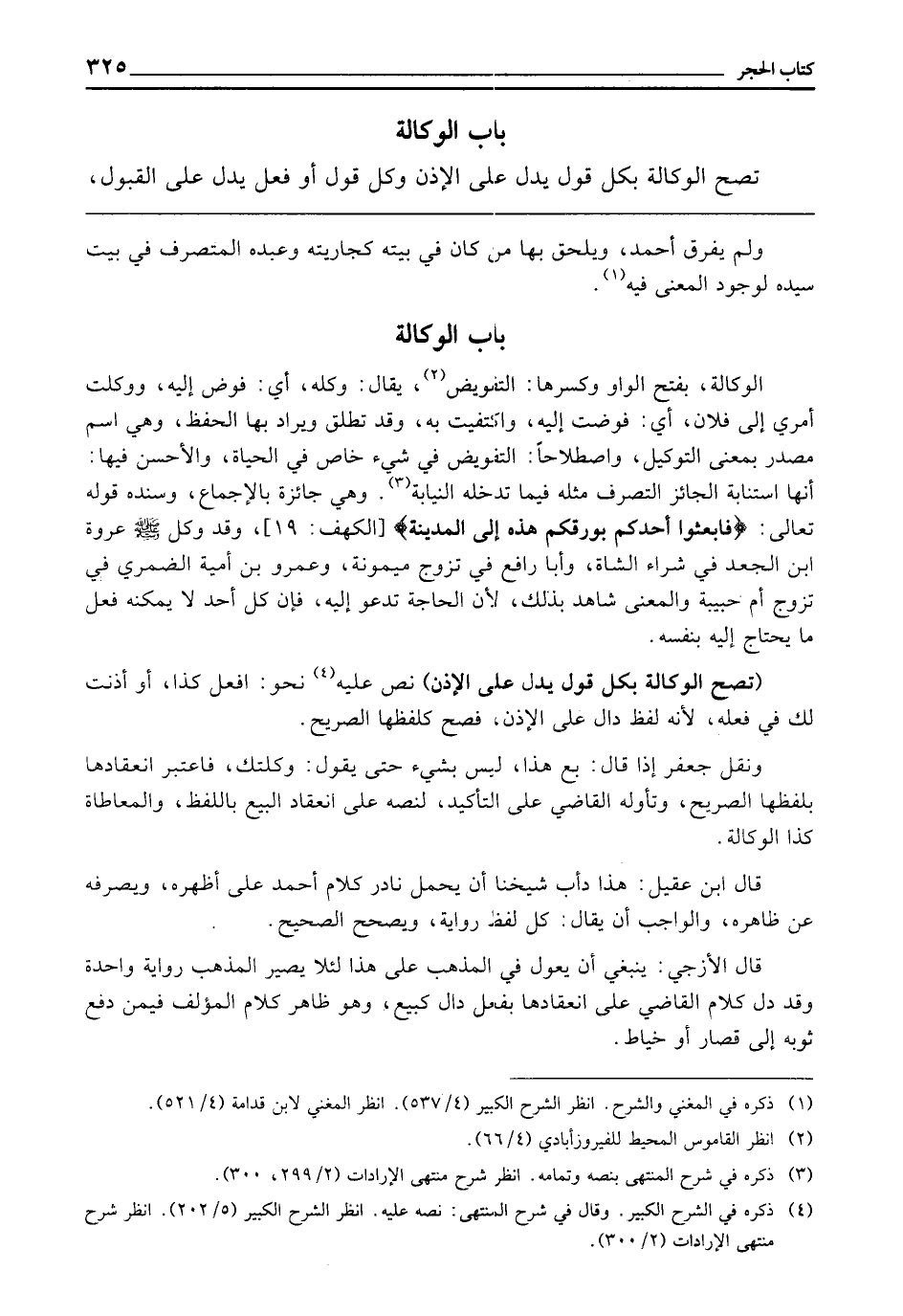 بَابُ الْوَكَالَةِ الْوَكَالَةُ بِفَتْحِ الْوَاوِ وَكَسْرِهَا: التَّفْوِيضُ يُقَالُ وَكَّلَهُ أَيْ: فَوَّضَ إِلَيْهِ، وَوَكَلْتُ أَمْرِي إِلَى فُلَانٍ أَيْ: فَوَّضْتُ إِلَيْهِ وَاكْتَفَيْتُ بِهِ، وَقَدْ تُطْلَقُ وَيُرَادُ بِهَا الْحِفْظُ وَهِيَ اسْمُ مَصْدَرٍ بِمَعْنَى التَّوْكِيلِ. وَاصْطِلَاحًا: التَّفْوِيضُ فِي شَيْءٍ خَاصٍّ فِي الْحَيَاةِ، وَالْأَحْسَنُ فِيهَا: أَنَّهَا اسْتِنَابَةُ الْجَائِزِ التَّصَرُّفِ مِثْلَهُ فِيمَا تَدْخُلُهُ النِّيَابَةُ، وَهِيَ جَائِزَةٌ بِالْإِجْمَاعِ، وَسَنَدُهُ قَوْله تَعَالَى: {فَابْعَثُوا أَحَدَكُمْ بِوَرِقِكُمْ هَذِهِ إِلَى الْمَدِينَةِ} [الكهف: 19] ، وَقَدْ وَكَّلَ - صَلَّى اللَّهُ عَلَيْهِ وَسَلَّمَ - عُرْوَةَ بْنَ الْجَعْدِ فِي شِرَاءِ الشَّاةِ، وَأَبَا رَافِعٍ فِي تَزَوُّجِ مَيْمُونَةَ، وَعَمْرَو بْنَ أُمَيَّةَ الضَّمْرِيَّ فِي تَزَوُّجِ أُمِّ حَبِيبَةَ، وَالْمَعْنَى شَاهِدٌ بِذَلِكَ، لِأَنَّ الْحَاجَةَ تَدْعُو إِلَيْهِ، فَإِنَّ كُلَّ أَحَدٍ لَا يُمْكِنُهُ فِعْلُ مَا يَحْتَاجُ إِلَيْهِ بِنَفْسِهِ.
