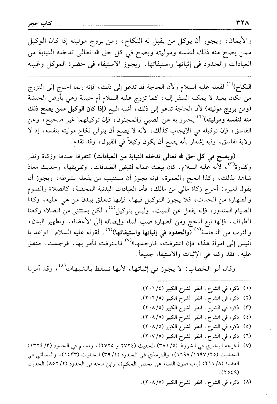(وَيَصِحُّ فِي كُلِّ حَقٍّ لِلَّهِ تَعَالَى تَدْخُلُهُ النِّيَابَةُ مِنَ الْعِبَادَاتِ) كَتَفْرِقَةِ صَدَقَةٍ، وَزَكَاةٍ، وَنَذْرٍ، وَكَفَّارَةٍ، لِأَنَّهُ - عَلَيْهِ السَّلَامُ - كَانَ يَبْعَثُ عُمَّالَهُ لِقَبْضِ الصَّدَقَاتِ وَتَفْرِيقِهَا، وَحَدِيثُ مُعَاذٍ شَاهِدٌ بِذَلِكَ، وَكَذَا الْحَجُّ، وَالْعُمْرَةُ، فَإِنَّهُ يَجُوزُ أَنْ يَسْتَنِيبَ مَنْ يَفْعَلُهُ بِشَرْطِهِ وَيَجُوزُ أَنْ يَقُولَ لِغَيْرِهِ: أَخْرِجْ زَكَاةَ مَالِي مِنْ مَالِكَ، فَأَمَّا الْعِبَادَاتُ الْبَدَنِيَّةُ الْمَحْضَةُ كَالصَّلَاةِ، وَالصَّوْمِ، وَالطَّهَارَةِ مِنَ الْحَدَثِ، فَلَا يَجُوزُ التَّوْكِيلُ فِيهَا، فَإِنَّهَا تَتَعَلَّقُ بِبَدَنِ مَنْ هِيَ عَلَيْهِ، وَكَذَا الصِّيَامُ الْمَنْذُورُ، فَإِنَّهُ يُفْعَلُ عَنِ الْمَيِّتِ، وَلَيْسَ بِتَوْكِيلٍ، لَكِنْ يُسْتَثْنَى مِنَ الصَّلَاةِ رَكَعَتَا الطَّوَافِ، فَإِنَّهَا تَبَعٌ لِلْحَجِّ وَمِنَ الطَّهَارَةِ صَبُّ الْمَاءِ وَإِيصَالُهُ إِلَى الْأَعْضَاءِ وَتَطْهِيرُ الْبَدَنِ وَالثَّوْبِ مِنَ النَّجَاسَةِ (وَالْحُدُودِ فِي إِثْبَاتِهَا وَاسْتِيفَائِهَا) لِقَوْلِهِ - عَلَيْهِ السَّلَامُ -: «وَاغْدُ يَا أُنَيْسُ إِلَى امْرَأَةِ هَذَا، فَإِنِ اعْتَرَفَتْ فَارْجُمْهَا، فَاعْتَرَفَتْ فَأَمَرَ بِهَا فَرُجِمَتْ» . مُتَّفَقٌ عَلَيْهِ، فَقَدْ وَكَّلَهُ فِي الْإِثْبَاتِ، وَالِاسْتِيفَاءِ جَمِيعًا.