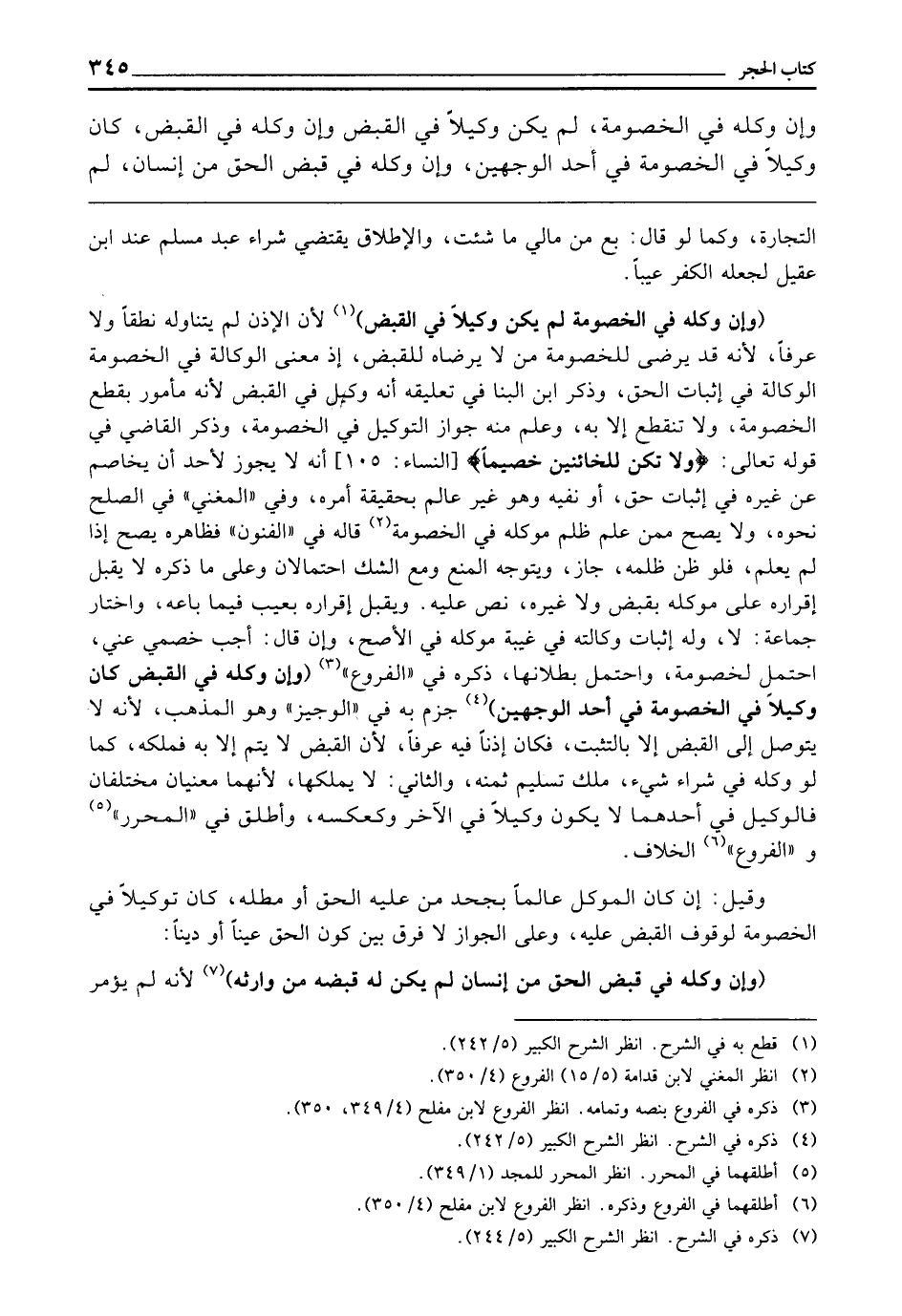 وَقِيلَ: إِنْ كَانَ الْمُوَكِّلُ عَالِمًا بِجَحْدِ مَنْ عَلَيْهِ الْحَقُّ، أَوْ مَطْلِهِ كَانَ تَوْكِيلًا فِي الْخُصُومَةِ لِوُقُوفِ الْقَبْضِ عَلَيْهِ، وَعَلَى الْجَوَازِ لَا فَرْقَ بَيْنَ كَوْنِ الْحَقِّ عَيْنًا، أَوْ دَيْنًا.