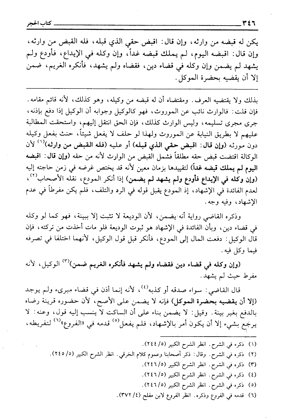 قَالَ الْقَاضِي: سَوَاءٌ صَدَّقَهُ، أَوْ كَذَّبَهُ، لِأَنَّهُ إِنَّمَا أَذِنَ فِي قَضَاءٍ مُبَرِّئٍ، وَلَمْ يُوجَدْ (إِلَّا أَنْ يَقْضِيَهُ بِحَضْرَةِ الْمُوَكِّلِ) ، فَإِنَّهُ لَا يَضْمَنُ عَلَى الْأَصَحِّ، لِأَنَّ حُضُورَهُ قَرِينَةُ رِضَاهُ بِالدَّفْعِ بِغَيْرِ بَيِّنَةٍ، وَقِيلَ: لَا يَضْمَنُ بِنَاءً عَلَى أَنَّ السَّاكِتَ لَا يُنْسَبُ إِلَيْهِ قَوْلٌ، وَعَنْهُ: لَا يَرْجِعُ بِشَيْءٍ إِلَّا أَنْ يَكُونَ أُمِرَ بِالْإِشْهَادِ، فَلَمْ يَفْعَلْ، قَدَّمَهُ فِي " الْفُرُوعِ " لِتَفْرِيطِهِ