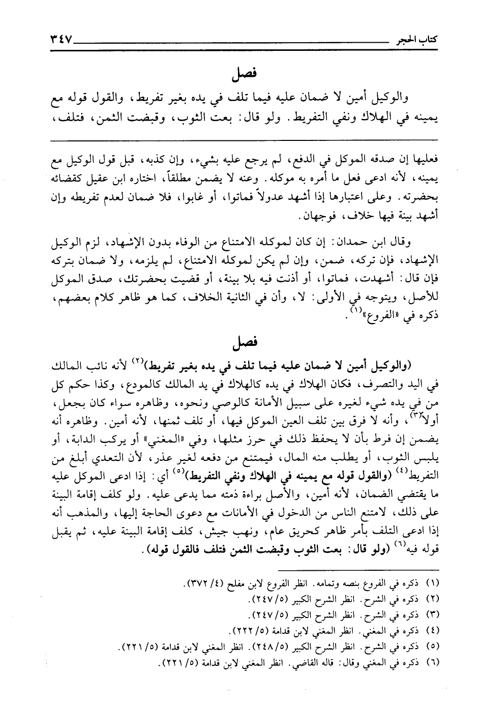 [الْوَكِيلُ أَمِينٌ لَا ضَمَانَ عَلَيْهِ فِيمَا تَلِفَ فِي يَدِهِ مِنْ غَيْرِ تَفْرِيطٍ]