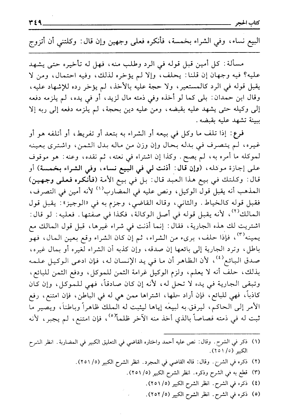 الْبَيْعِ نَسَاءً، وَفِي الشِّرَاءِ بِخَمْسَةٍ، فَأَنْكَرَهُ، فَعَلَى وَجْهَيْنِ وَإِنْ قَالَ: وَكَّلْتَنِي أَنْ أَتَزَوَّجَ