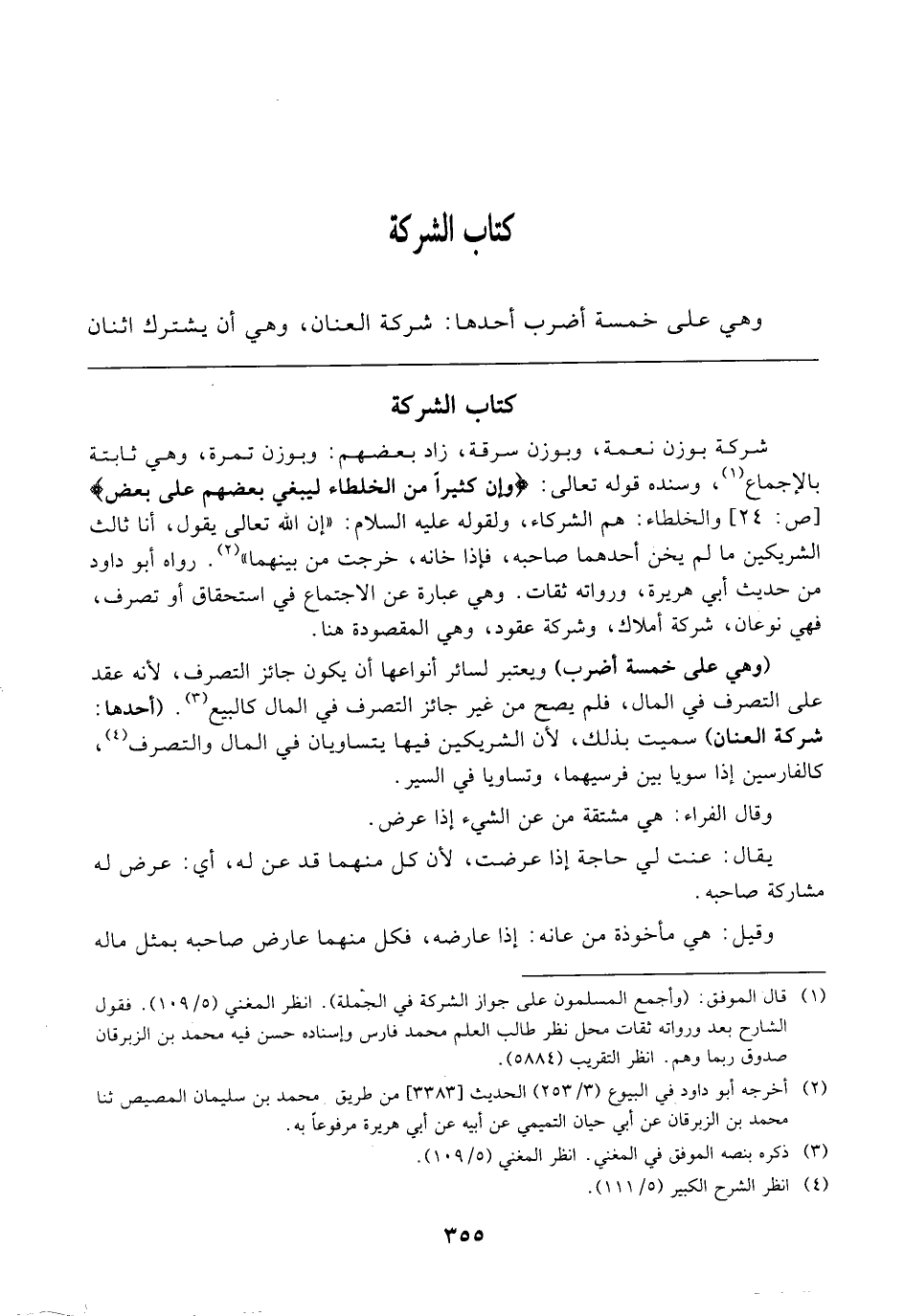 كِتَابُ الشَّرِكَةِ وَهِيَ عَلَى خَمْسَةِ أَضْرُبٍ، أَحَدُهَا: شَرِكَةُ الْعِنَانِ وَهِيَ أَنْ يَشْتَرِكَ اثْنَانِ
