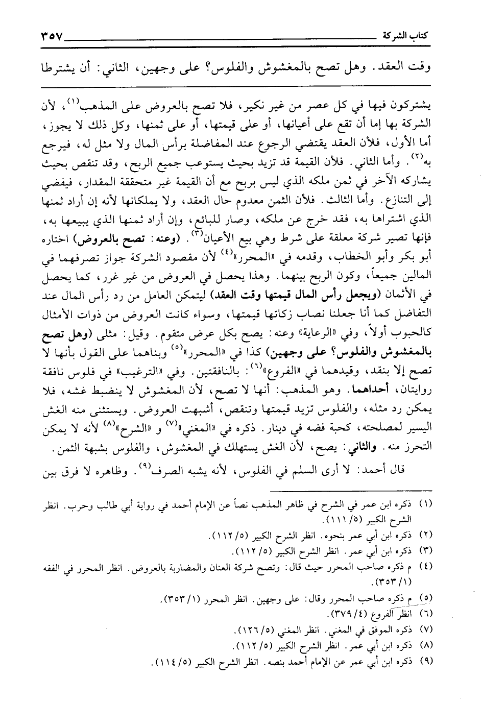ـــــــــــــــــــــــــــــQيَشْتَرِكُونَ فِيهَا فِي كُلِّ عَصْرٍ مِنْ غَيْرِ نَكِيرٍ فَلَا تَصِحُّ بِالْعُرُوضِ عَلَى الْمَذْهَبِ ; لِأَنَّ الشَّرِكَةَ بِهَا إِمَّا أَنْ تَقَعَ عَلَى أَعْيَانِهَا، أَوْ عَلَى قِيمَتِهَا، أَوْ عَلَى ثَمَنِهَا، وَكُلُّ ذَلِكَ لَا يَجُوزُ، أَمَّا الْأَوَّلُ، فَلِأَنَّ الْعَقْدَ يَقْتَضِي الرُّجُوعَ عِنْدَ الْمُفَاضَلَةِ بِرَأْسِ الْمَالِ، وَلَا مِثْلَ لَهُ، فَيَرْجِعُ بِهِ، وَأَمَّا الثَّانِي، فَلِأَنَّ الْقِيمَةَ قَدْ تَزِيدُ بِحَيْثُ يَسْتَوْعِبُ جَمِيعَ الرِّبْحِ، وَقَدْ تَنْقُصُ بِحَيْثُ يُشَارِكُهُ الْآخَرُ فِي ثَمَنِ مِلْكِهِ الَّذِي لَيْسَ بِرِبْحٍ مَعَ أَنَّ الْقِيمَةَ غَيْرُ مُتَحَقِّقَةِ الْمِقْدَارِ، فَيُفْضِي إِلَى التَّنَازُعِ، وَأَمَّا الثَّالِثُ، فَلِأَنَّ الثَّمَنَ مَعْدُومٌ حَالَ الْعَقْدِ، وَلَا يَمْلِكَانِهَا لِأَنَّهُ إِنْ أَرَادَ ثَمَنَهَا الَّذِي اشْتَرَاهَا بِهِ فَقَدْ خَرَجَ عَنْ مِلْكِهِ وَصَارَ لِلْبَائِعِ، وَإِنْ أَرَادَ ثَمَنَهَا الَّذِي يَبِيعُهَا بِهِ، فَإِنَّهَا تَصِيرُ شَرِكَةً مُعَلَّقَةً عَلَى شَرْطٍ وَهِيَ بَيْعُ الْأَعْيَانِ (وَعَنْهُ تَصِحُّ بِالْعُرُوضِ) اخْتَارَهُ أَبُو بَكْرٍ، وَأَبُو الْخَطَّابِ، وَقَدَّمَهُ فِي " الْمُحَرَّرِ " ; لِأَنَّ مَقْصُودَ الشَّرِكَةِ جَوَازُ تَصَرُّفِهِمَا فِي الْمَالَيْنِ جَمِيعًا، وَكَوْنُ الرِّبْحِ بَيْنَهُمَا، وَهَذَا يَحْصُلُ فِي الْعُرُوضِ مِنْ غَيْرِ غَرَرٍ كَمَا يَحْصُلُ فِي الْأَثْمَانِ (وَيُجْعَلُ رَأْسُ الْمَالِ قِيمَتَهَا وَقْتَ الْعَقْدِ) لِيَتَمَكَّنَ الْعَامِلُ مِنْ رَدِّ رَأْسِ الْمَالِ عِنْدَ التَّفَاضُلِ كَمَا أَنَّا جَعَلْنَا نِصَابَ زَكَاتِهَا قِيمَتَهَا، وَسَوَاءٌ كَانَتِ الْعُرُوضُ مِنْ ذَوَاتِ الْأَمْثَالِ كَالْحُبُوبِ أَوْ لَا، وَفِي " الرِّعَايَةِ ": وَعَنْهُ يَصِحُّ بِكُلِّ عَرَضٍ مُتَقَوِّمٍ، وَقِيلَ مِثْلِيٍّ (وَهَلْ تَصِحُّ بِالْمَغْشُوشِ وَالْفُلُوسِ؟ عَلَى وَجْهَيْنِ) كَذَا فِي " الْمُحَرَّرِ "، وَبَنَاهُمَا عَلَى الْقَوْلِ بِأَنَّهَا لَا تَصِحُّ إِلَّا بِنَقْدٍ، وَقَيَّدَهُمَا فِي " الْفُرُوعِ " بِالنَّافِقَتَيْنِ، وَفِي " التَّرْغِيبِ " فِي فُلُوسٍ نَافِقَةٍ رِوَايَتَانِ، إحَداهُمَا وَهُوَ الْمَذْهَبُ أَنَّهَا لَا تَصِحُّ ; لِأَنَّ الْمَغْشُوشَ لَا يَنْضَبِطُ غِشُّهُ فَلَا يُمْكِنُ رَدُّ مِثْلِهِ، وَالْفُلُوسُ تَزِيدُ قِيمَتُهَا وَتَنْقُصُ، أَشْبَهَتِ الْعُرُوضَ، وَيُسْتَثْنَى مِنْهُ الْغِشُّ الْيَسِيرُ لِمَصْلَحَتِهِ كَحَبَّةِ فِضَّةٍ فِي دِينَارٍ، ذَكَرَهُ فِي " الْمُغْنِي " وَ " الشَّرْحِ " لِأَنَّهُ لَا يُمْكِنُ التَّحَرُّزُ مِنْهُ، وَالثَّانِي يَصِحُّ ; لِأَنَّ الْغِشَّ يُسْتَهْلَكُ فِي الْمَغْشُوشِ وَالْفُلُوسِ بِشُبْهَةِ الثَّمَنِ.