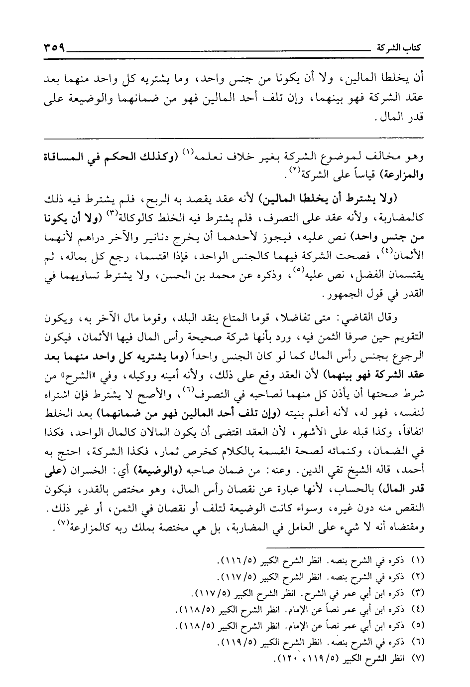 ـــــــــــــــــــــــــــــQوَهُوَ مُخَالِفٌ لِمَوْضُوعِ الشَّرِكَةِ بِغَيْرِ خِلَافٍ نَعْلَمُهُ (وَكَذَلِكَ الْحُكْمُ فِي الْمُسَاقَاةِ، وَالْمُزَارَعَةِ) قِيَاسًا عَلَى الشَّرِكَةِ.