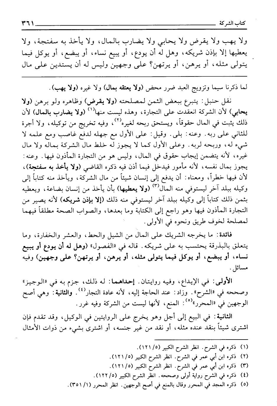 نَقَلَ حَنْبَلٌ: يَتَبَرَّعُ بِبَعْضِ الثَّمَنِ لِمَصْلَحَتِهِ (وَلَا يُقْرِضَ) وَظَاهِرُهُ وَلَوْ بِرَهْنٍ (وَلَا يُحَابِيَ) لِأَنَّ الشَّرِكَةَ انْعَقَدَتْ عَلَى التِّجَارَةِ وَهَذِهِ لَيْسَتْ مِنْهَا (وَلَا يُضَارِبَ بِالْمَالِ) لِأَنَّ ذَلِكَ يُثْبِتُ فِي الْمَالِ حُقُوقًا، وَيُسْتَحَقُّ رِبْحُهُ لِغَيْرِهِ، وَفِيهِ تَخْرِيجٌ مِنْ تَوْكِيلِهِ، وَلَا أُجْرَةَ لِلثَّانِي عَلَى رَبِّهِ، وَعَنْهُ: بَلَى، وَقِيلَ: عَلَى الْأَوَّلِ مَعَ جَهْلِهِ لِدَفْعِ غَاصِبٍ، وَمَعَ عِلْمِهِ لَا شَيْءَ لَهُ، وَرِبْحُهُ لِرَبِّهِ، وَعَلَى الْأَوَّلِ كَمَا لَا يَجُوزُ لَهُ خَلْطُ مَالِ الشَّرِكَةِ بِمَالِهِ وَلَا مَالِ غَيْرِهِ ; لِأَنَّهُ يَتَضَمَّنُ إِيجَابَ حُقُوقٍ فِي الْمَالِ، وَلَيْسَ هُوَ مِنَ التِّجَارَةِ الْمَأْذُونِ فِيهَا، وَعَنْهُ: يَجُوزُ بِمَالِ نَفْسِهِ ; لِأَنَّهُ مَأْمُورٌ، فَيَدْخُلُ فِيمَا أَذِنَ فِيهِ، ذَكَرَهُ الْقَاضِي (وَلَا يَأْخُذَ بِهِ سُفْتَجَةً) لِأَنَّ فِيهَا خَطَرًا، وَمَعْنَاهُ أَنْ يَدْفَعَ إِلَى إِنْسَانٍ شَيْئًا مِنْ مَالِ الشَّرِكَةِ وَيَأْخُذَ مِنْهُ كِتَابًا إِلَى وَكِيلِهِ بِبَلَدٍ آخَرَ لِيَسْتَوْفِيَ مِنْهُ الْمَالَ (وَلَا يُعْطِيَهَا) بِأَنْ يَأْخُذَ مِنْ إِنْسَانٍ بِضَاعَةً، وَيُعْطِيَهُ بِثَمَنِ ذَلِكَ كِتَابًا إِلَى وَكِيلِهِ بِبَلَدٍ آخَرَ لِيَسْتَوْفِيَ مِنْهُ ذَلِكَ (إِلَّا بِإِذْنِ شَرِيكِهِ) لِأَنَّهُ يَصِيرُ مِنَ التِّجَارَةِ الْمَأْذُونِ فِيهَا، وَهُوَ رَاجِعٌ إِلَى الْكِتَابَةِ وَمَا بَعْدَهَا، وَالصَّوَابُ الصِّحَّةُ مُطْلَقًا فِيهِمَا لِمَصْلَحَةٍ لِخَوْفِ طَرِيقٍ وَنَحْوِهِ فِي الْأُولَى.