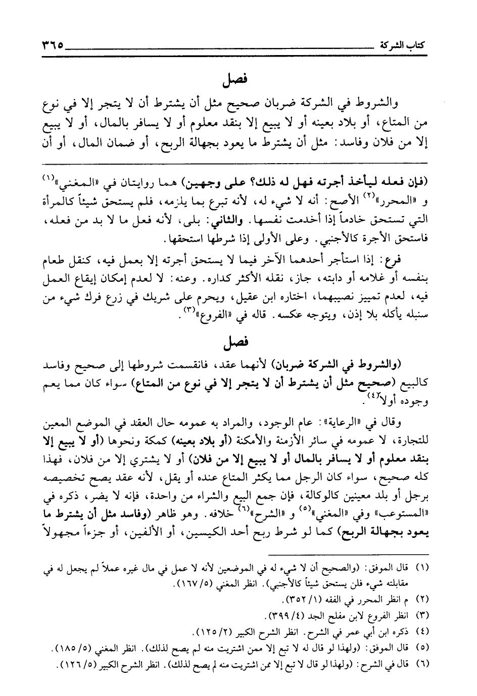 فَصْلٌ وَالشُّرُوطُ فِي الشَّرِكَةِ ضَرْبَانِ: صَحِيحٌ مِثْلُ أَنْ يَشْتَرِطَ أَنْ لَا يَتَّجِرَ إِلَّا فِي نَوْعٍ مِنَ الْمَتَاعِ أَوْ بَلَدٍ بِعَيْنِهِ، أَوْ لَا يَبِيعَ إِلَّا بِنَقْدٍ مَعْلُومٍ، أَوْ لَا يُسَافِرَ بِالْمَالِ، أَوْ لَا يَبِيعَ إِلَّا مِنْ فُلَانٍ.