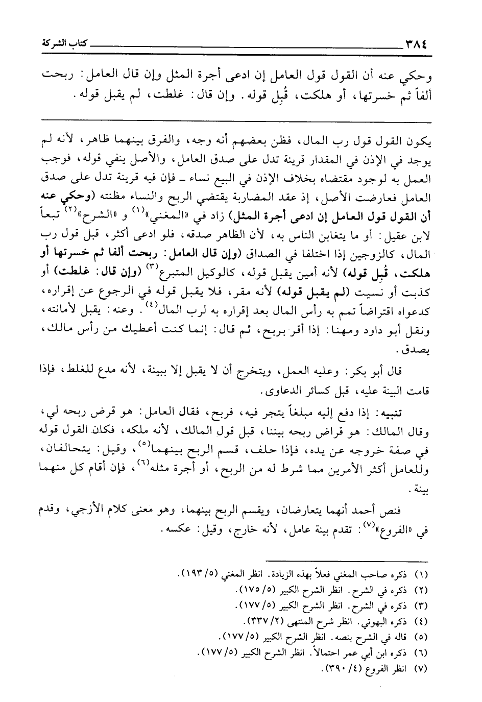 ـــــــــــــــــــــــــــــQيَكُونَ الْقَوْلُ قَوْلَ رَبِّ الْمَالِ، فَظَنَّ بَعْضُهُمْ أَنَّهُ وَجْهٌ، وَالْفَرْقُ بَيْنَهُمَا ظَاهِرٌ ; لِأَنَّهُ لَمْ يُوجَدْ فِي الْإِذْنِ فِي الْمِقْدَارِ قَرِينَةٌ تَدُلُّ عَلَى صِدْقِ الْعَامِلِ، وَالْأَصْلُ يَنْفِي قَوْلَهُ، فَوَجَبَ الْعَمَلُ بِهِ لِوُجُودِ مُقْتَضَاهُ بِخِلَافِ الْإِذْنِ فِي الْبَيْعِ نَسَاءً، فَإِنَّ فِيهِ قَرِينَةً تَدُلُّ عَلَى صِدْقِ الْعَامِلِ، فَعَارَضَتِ الْأَصْلَ إِذْ عَقْدُ الْمُضَارَبَةَ يَقْتَضِي الرِّبْحَ وَالنَّسَاءُ مَظِنَّتُهُ (وَحُكِيَ عَنْهُ أَنَّ الْقَوْلَ قَوْلُ الْعَامِلِ إِنِ ادَّعَى أُجْرَةَ الْمِثْلِ) زَادَ فِي " الْمُغْنِي " وَ " الشَّرْحِ " تَبَعًا لِابْنِ عَقِيلٍ: أَوْ مَا يَتَغَابَنُ النَّاسُ بِهِ ; لِأَنَّ الظَّاهِرَ صِدْقُهُ، فَلَوِ ادَّعَى أَكْثَرَ قُبِلَ قَوْلُ رَبِّ الْمَالِ، كَالزَّوْجَيْنِ إِذَا اخْتَلَفَا فِي الصَّدَاقِ (وَإِنْ قَالَ الْعَامِلُ: رَبِحْتُ أَلْفًا ثُمَّ خَسِرْتُهَا أَوْ هَلَكَتْ، قُبِلَ قَوْلُهُ) لِأَنَّهُ أَمِينٌ يُقْبَلُ قَوْلُهُ كَالْوَكِيلِ الْمُتَبَرِّعِ (وَإِنْ قَالَ: غَلِطْتُ) أَوْ كَذَبْتُ، أَوْ نَسِيتُ (لَمْ يُقْبَلْ قَوْلُهُ) لِأَنَّهُ مُقِرٌّ فَلَا يُقْبَلُ قَوْلُهُ فِي الرُّجُوعِ عَنْ إِقْرَارِهِ كَدَعْوَاهُ اقْتِرَاضًا تُمِّمَ بِهِ رَأْسُ الْمَالِ بَعْدَ إِقْرَارِهِ بِهِ لِرَبِّ الْمَالِ، وَعَنْهُ: يُقْبَلُ لِأَمَانَتِهِ، وَنَقَلَ أَبُو دَاوُدَ وَمُهَنَّا: إِذَا أَقَرَّ بِرِبْحٍ ثُمَّ قَالَ: إِنَّمَا كُنْتُ أُعْطِيكَ مِنْ رَأْسِ مَالِكَ، يُصَدَّقُ.