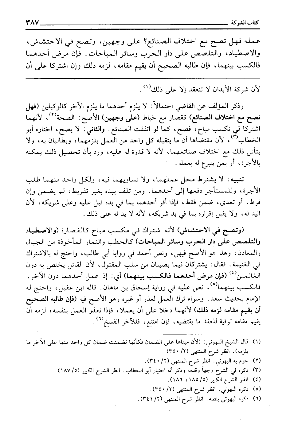 (وَتَصِحُّ فِي الِاحْتِشَاشِ) لِأَنَّهُ اشْتَرَاكٌ فِي مَكْسَبٍ مُبَاحٍ كَالْقِصَارَةِ (وَالِاصْطِيَادِ، وَالتَّلَصُّصِ عَلَى دَارِ الْحَرْبِ وَسَائِرِ الْمُبَاحَاتِ) كَالْحَطَبِ وَالثِّمَارِ الْمَأْخُوذَةِ مِنَ الْجِبَالِ، وَالْمَعَادِنِ، وَهَذَا هُوَ الْأَصَحُّ فِيهِنَّ، وَنَصَّ أَحْمَدُ فِي رِوَايَةِ أَبِي طَالِبٍ، وَاحْتَجَّ لَهُ بِالِاشْتِرَاكِ فِي الْغَنِيمَةِ، فَقَالَ: يَشْتَرِكَانِ فِيمَا يُصِيبَانِ مِنْ سَلَبِ الْمَقْتُولِ ; لِأَنَّ الْقَاتِلَ يَخْتَصُّ بِهِ دُونَ الْغَانِمِينَ (فَإِنْ مَرِضَ أَحَدُهُمَا فَالْكَسْبُ بَيْنَهُمَا) أَيْ إِذَا عَمِلَ أَحَدُهُمَا دُونَ الْآخَرِ فَالْكَسْبُ بَيْنَهُمَا، نَصَّ عَلَيْهِ فِي رِوَايَةِ إِسْحَاقَ بْنِ مَاهَانَ، قَالَهُ ابْنُ عَقِيلٍ، وَاحْتَجَّ لَهُ الْإِمَامُ بِحَدِيثِ سَعْدٍ، وَسَوَاءٌ تَرَكَ الْعَمَلَ لِعُذْرٍ أَوْ غَيْرِهِ، وَهُوَ الْأَصَحُّ فِيهِ (فَإِنْ طَالَبَهُ الصَّحِيحُ أَنْ يُقِيمَ مَقَامَهُ لَزِمَهُ ذَلِكَ) لِأَنَّهُمَا دَخَلَا عَلَى أَنْ يَعْمَلَا، فَإِذَا تَعَذَّرَ الْعَمَلُ بِنَفْسِهِ لَزِمَهُ أَنْ يُقِيمَ مَقَامَهُ تَوْفِيَةً لِلْعَقْدِ مَا يَقْتَضِيهِ فَإِنِ امْتَنَعَ فَلِلْآخَرِ الْفَسْخُ.