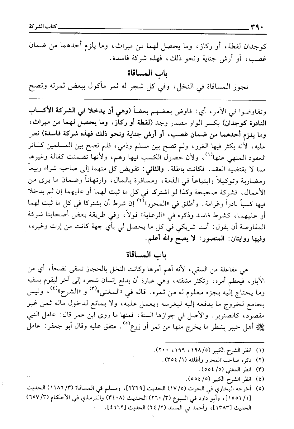 بَابُ الْمُسَاقَاةِ هِيَ مُفَاعَلَةٌ مِنَ السَّقْيِ ; لِأَنَّهُ أَهَمُّ أَمْرِهَا، وَكَانَتِ النَّخْلُ بِالْحِجَازِ تُسْقَى نَضْحًا أَيْ مِنَ الْآبَارِ، فَيَعْظُمُ أَمْرُهُ، وَتَكْثُرُ مَشَقَّتُهُ، وَهِيَ عِبَارَةُ أَنْ يَدْفَعَ إِنْسَانٌ شَجَرَهُ إِلَى آخَرَ لِيَقُومَ بِسَقْيِهِ، وَمَا يَحْتَاجُ إِلَيْهِ بِجُزْءٍ مَعْلُومٍ لَهُ مِنْ ثَمَرِهِ، قَالَهُ فِي " الْمُغْنِي "، وَ " الشَّرْحِ "، وَلَيْسَ بِجَامِعٍ لِخُرُوجِ مَا يَدْفَعُهُ إِلَيْهِ لِيَغْرِسَهُ، وَيَعْمَلَ عَلَيْهِ، وَلَا بِمَانِعٍ لِدُخُولِ مَا لَهُ ثَمَنٌ غَيْرُ مَقْصُودٍ كَالصَّنَوْبَرِ، وَالْأَصْلُ فِي جَوَازِهَا السُّنَّةُ، فَمِنْهَا مَا رَوَى ابْنُ عُمَرَ قَالَ: «عَامَلَ النَّبِيُّ - صَلَّى اللَّهُ عَلَيْهِ وَسَلَّمَ - ِأَهْلِ خَيْبَرَ بِشَطْرِ مَا يَخْرُجُ مِنْهَا مِنْ ثَمَرٍ أَوْ زَرْعٍ» ، مُتَّفَقٌ عَلَيْهِ، وَقَالَ أَبُو جَعْفَرٍ: عَامَلَ